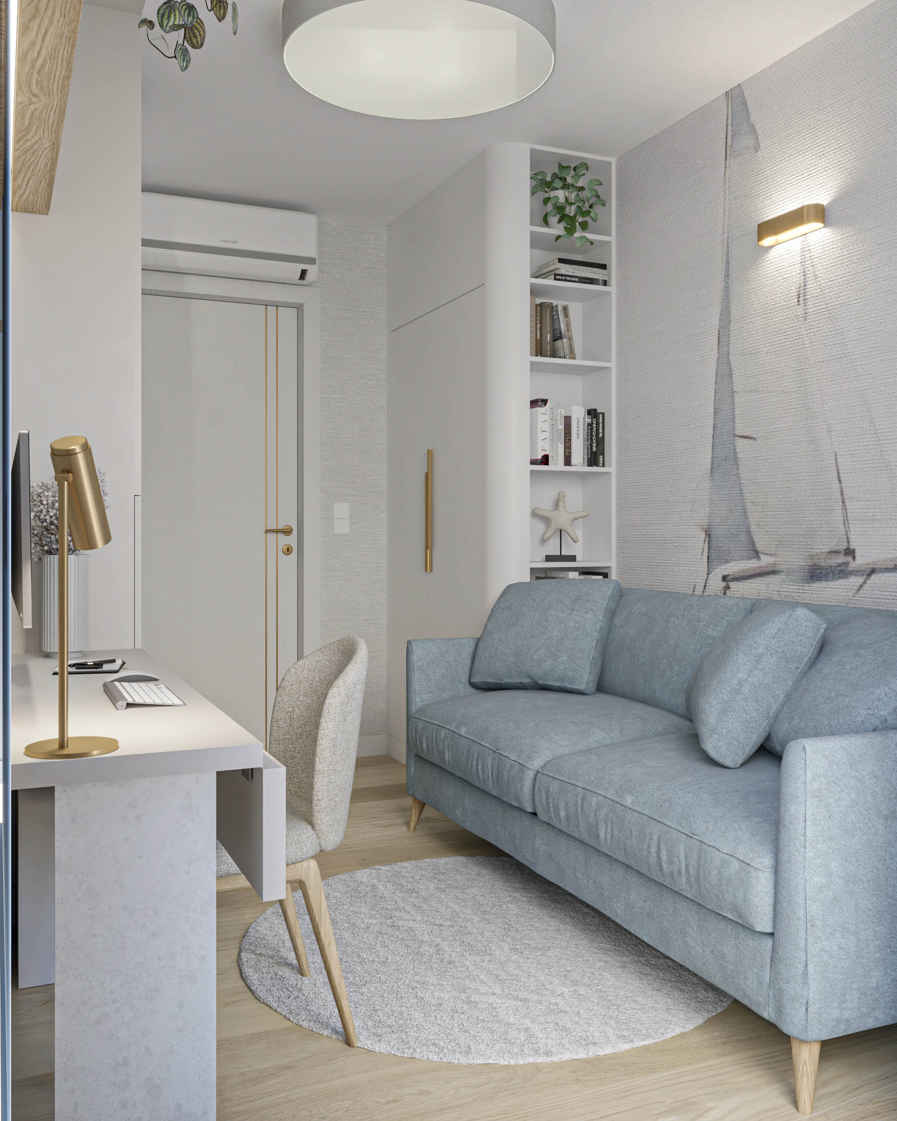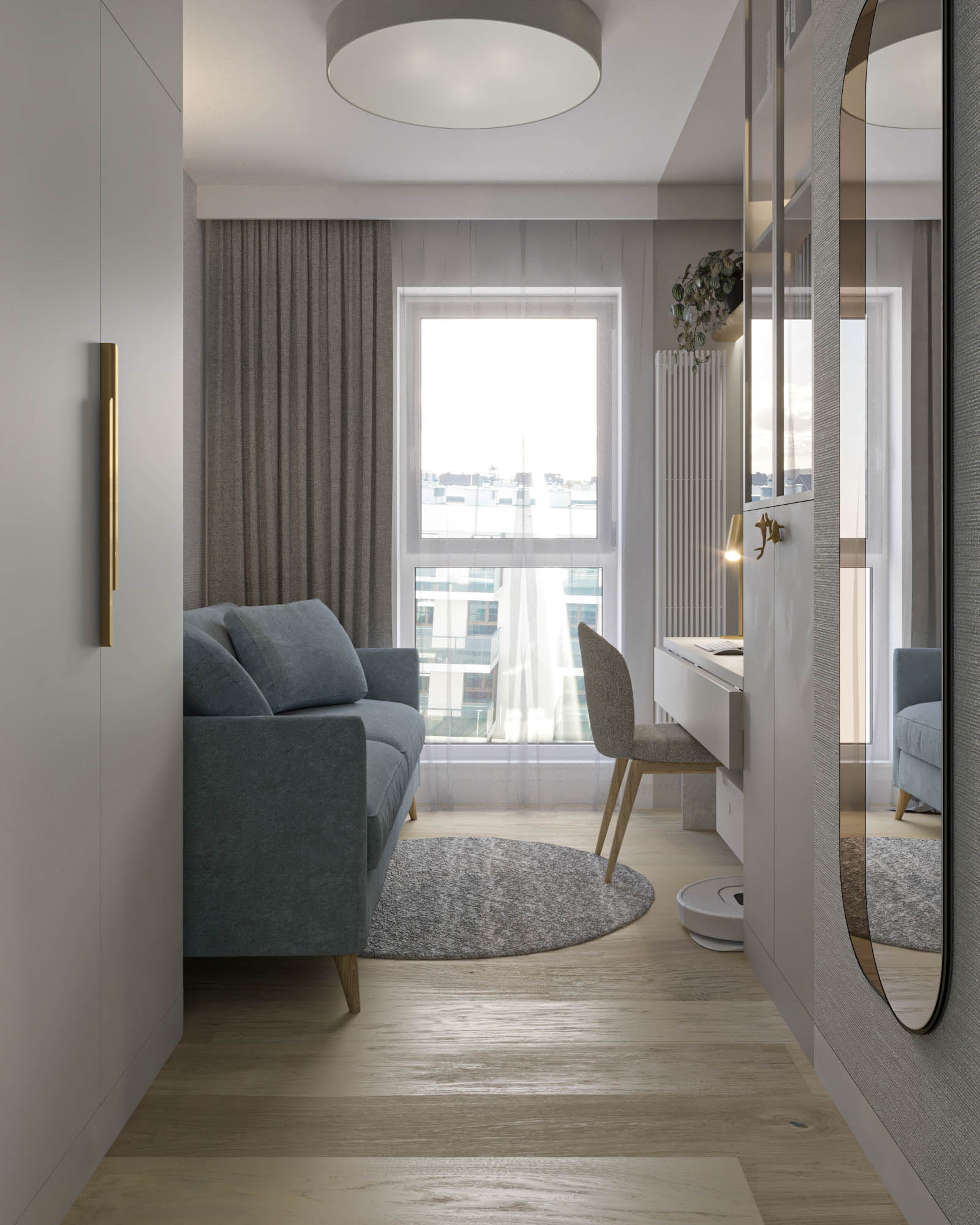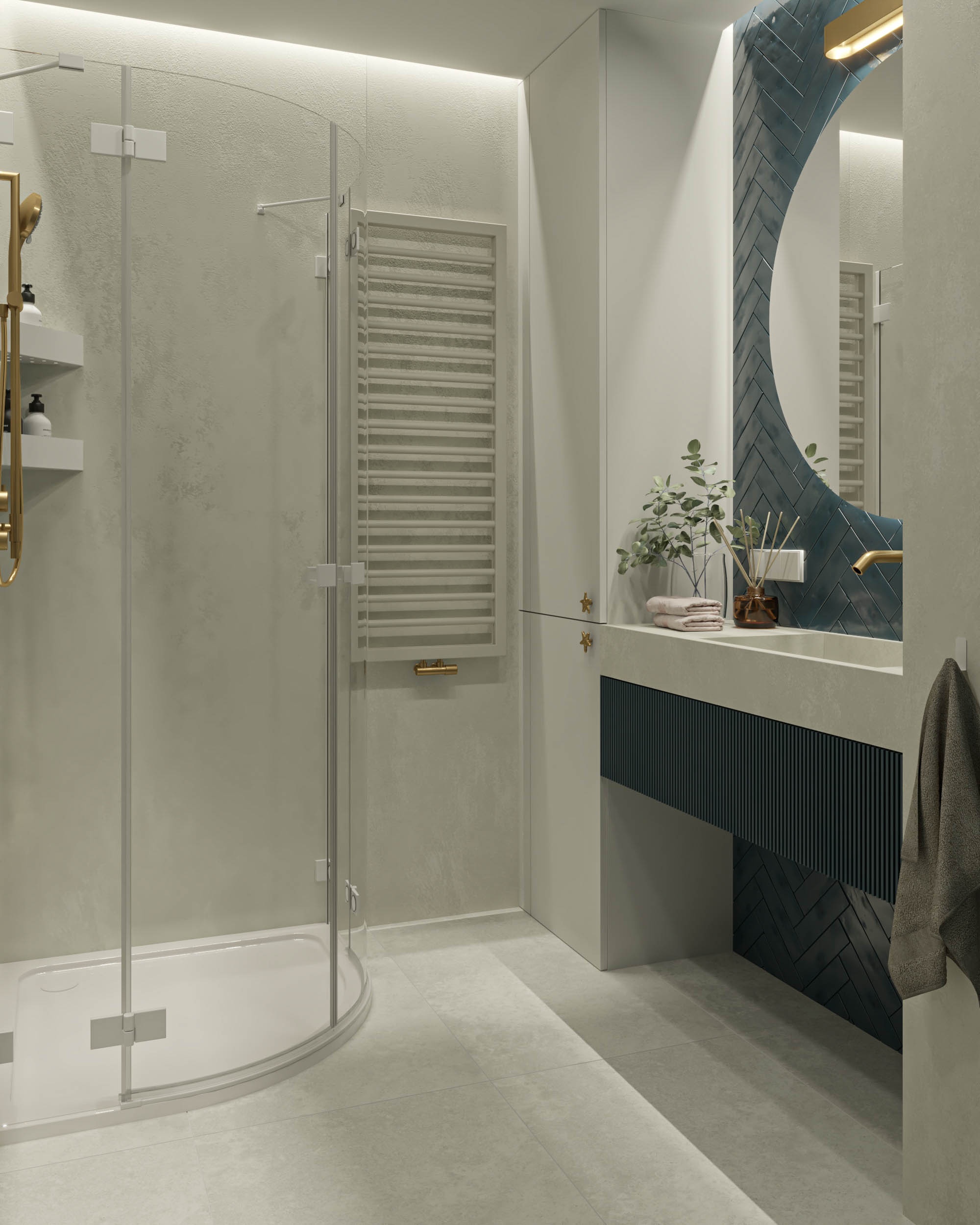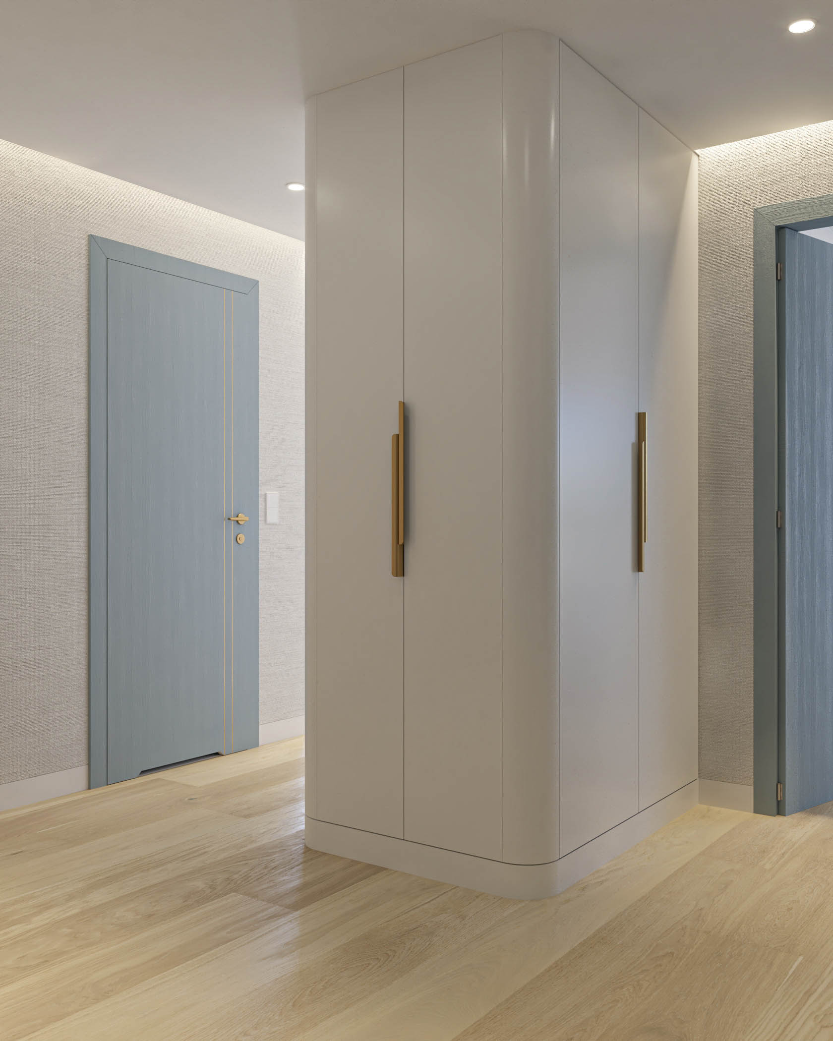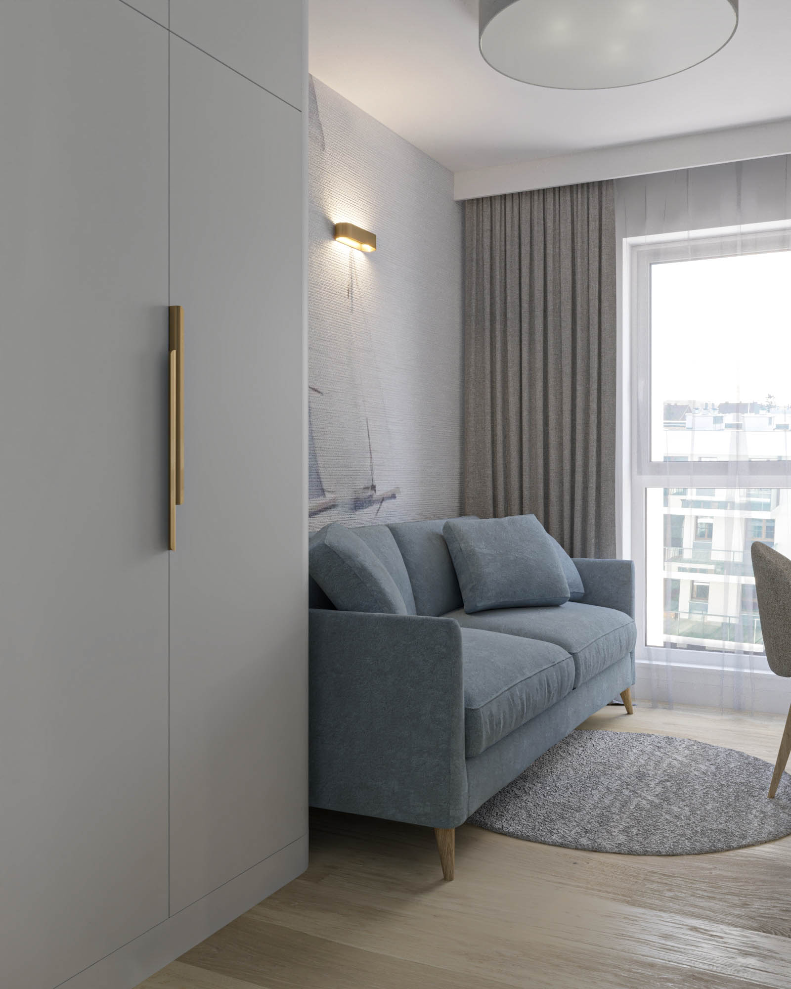 Mieszkanie zaprojektowano w nowoczesnym stylu, opartym na szlachetnych i trwałych materiałach. We wnętrzu zastosowano konglomerat kwarcowy, naturalne drewno na podłodze oraz wysokiej jakości włoską armaturę, które wspólnie budują elegancki i dopracowany charakter przestrzeni. Kolorystyka bazuje na złamanych bielach, ciepłych beżach i odcieniach błękitu oraz granatu. Ta spokojna paleta barw subtelnie nawiązuje do marynistycznego klimatu, wprowadzając do wnętrza świeżość i lekkość. Istotnym motywem kompozycyjnym są miękkie zaoblenia – widoczne w zabudowach stolarskich, lustrach i detalach mebli. Łagodzą one geometryczną prostotę brył, nadając wnętrzu lekkości i płynności. Całość łączy funkcjonalność z elegancją, tworząc harmonijną przestrzeń o wyraźnie dopracowanym, współczesnym charakterze.