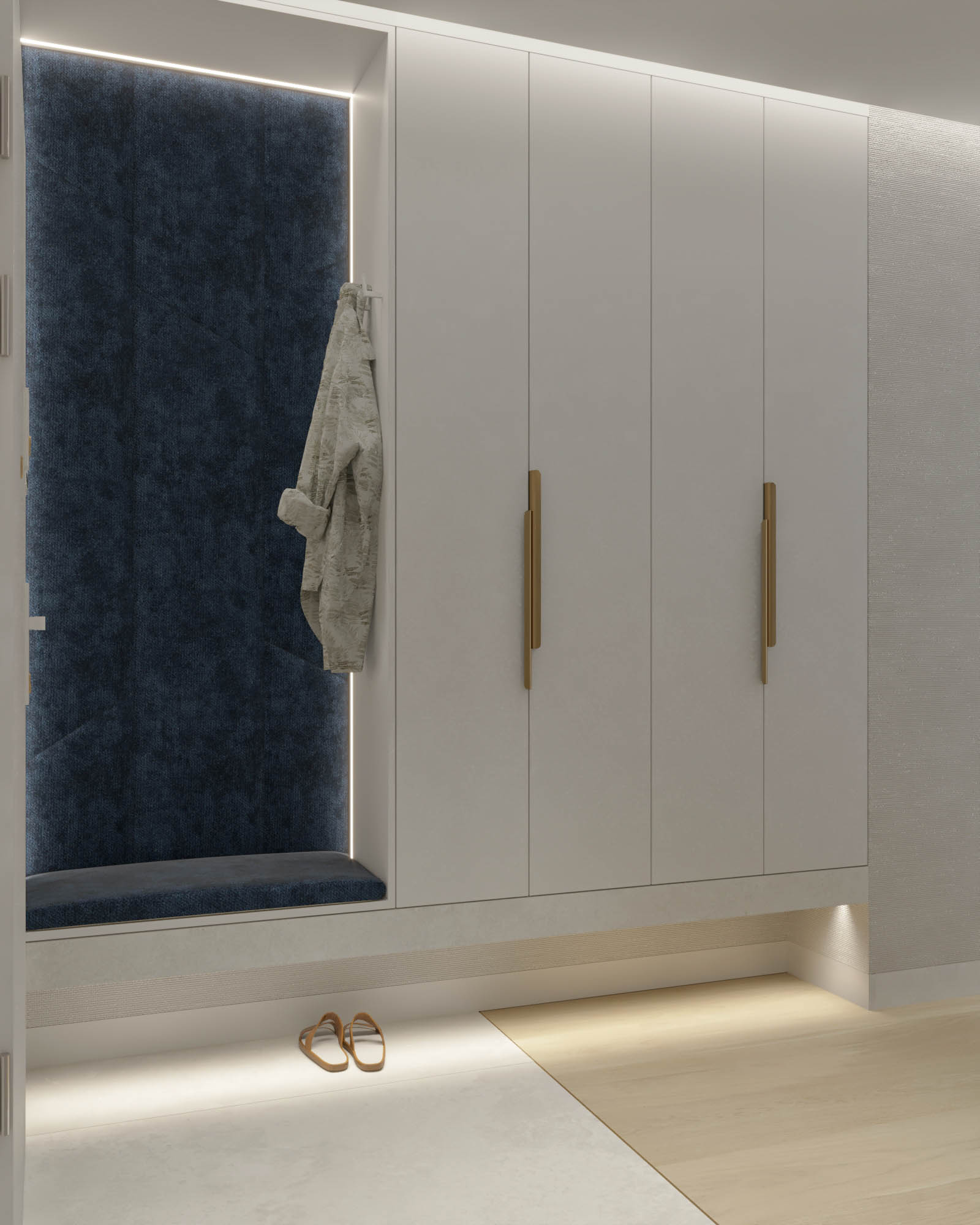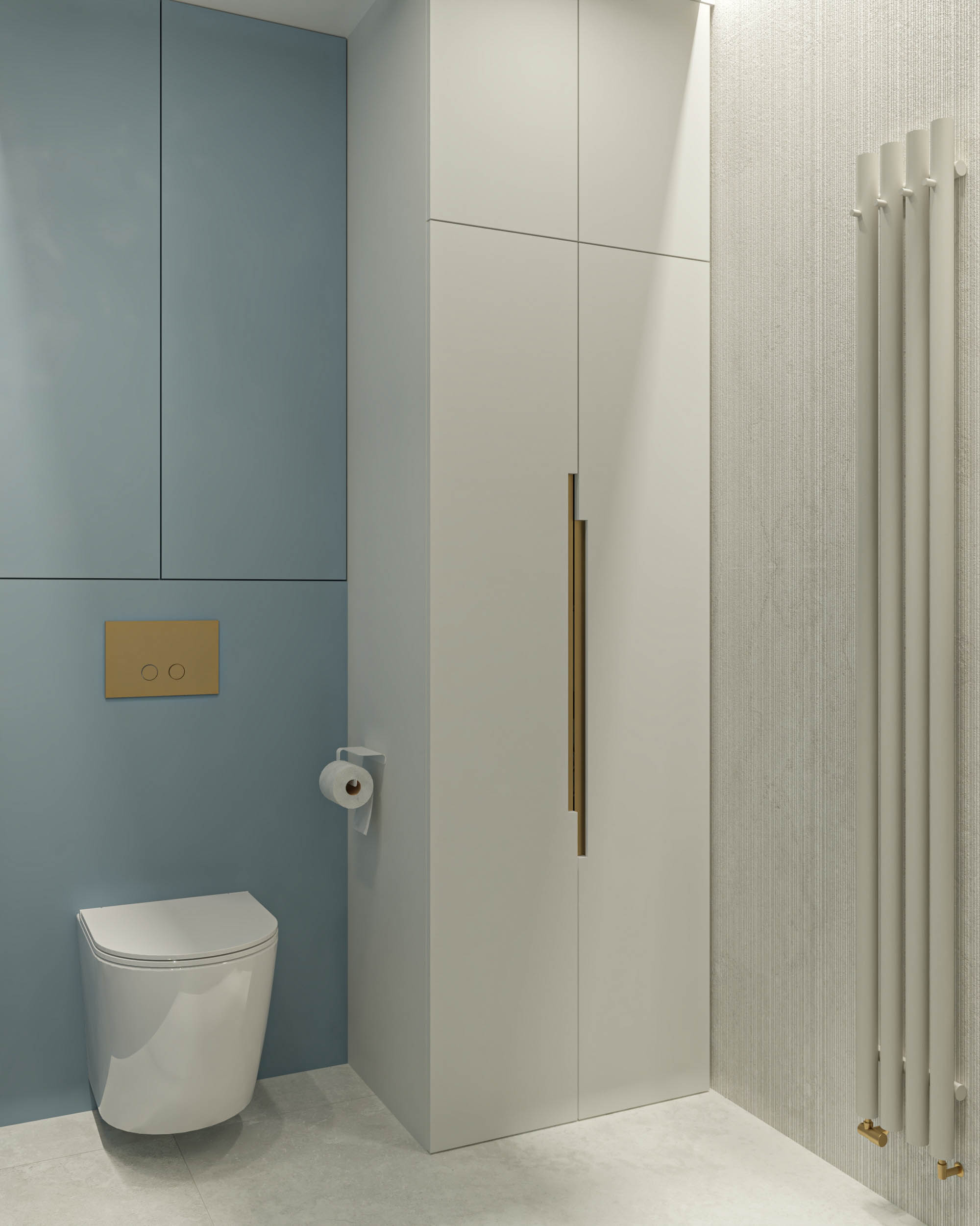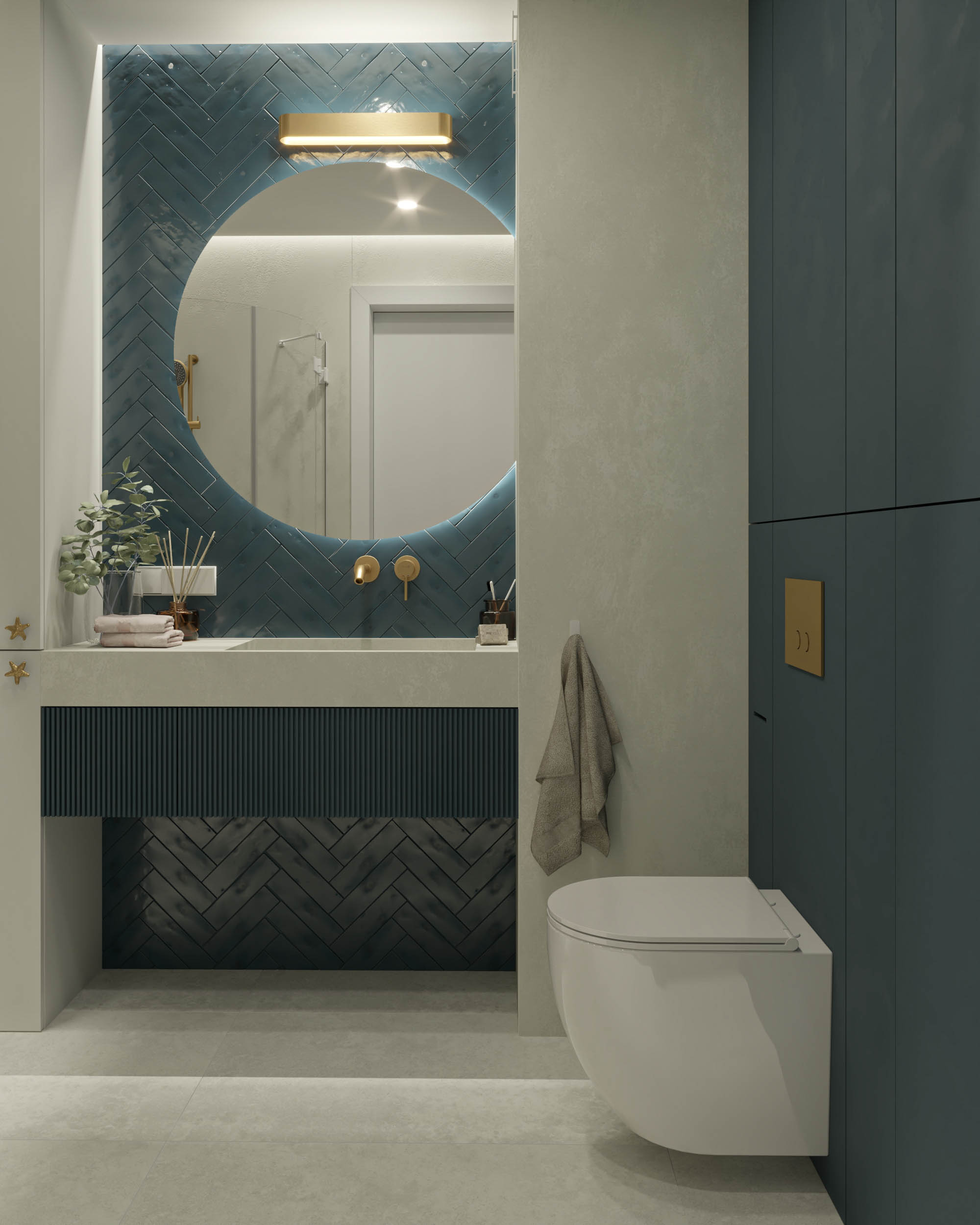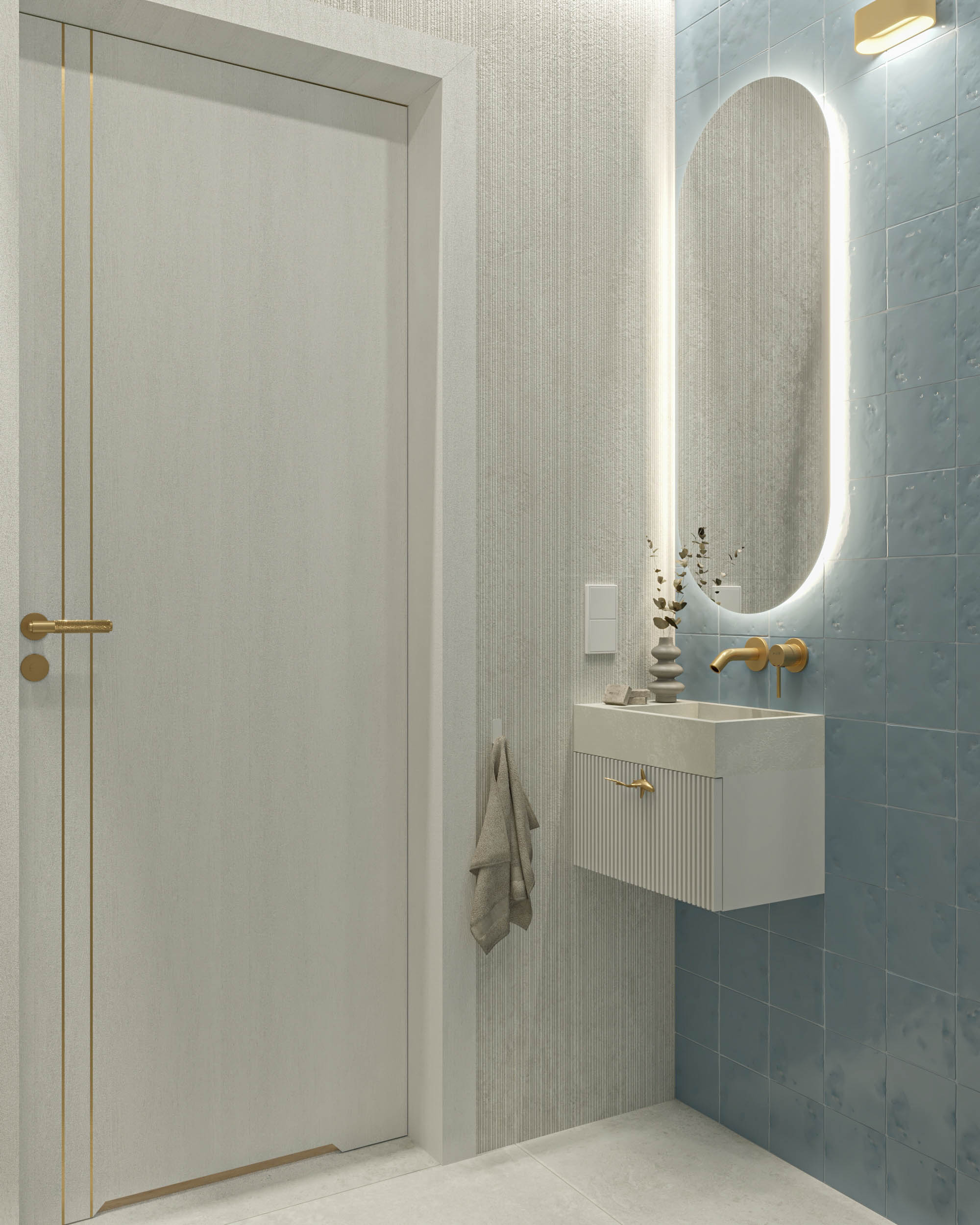 Mieszkanie zaprojektowano w nowoczesnym stylu, opartym na szlachetnych i trwałych materiałach. We wnętrzu zastosowano konglomerat kwarcowy, naturalne drewno na podłodze oraz wysokiej jakości włoską armaturę, które wspólnie budują elegancki i dopracowany charakter przestrzeni. Kolorystyka bazuje na złamanych bielach, ciepłych beżach i odcieniach błękitu oraz granatu. Ta spokojna paleta barw subtelnie nawiązuje do marynistycznego klimatu, wprowadzając do wnętrza świeżość i lekkość. Istotnym motywem kompozycyjnym są miękkie zaoblenia – widoczne w zabudowach stolarskich, lustrach i detalach mebli. Łagodzą one geometryczną prostotę brył, nadając wnętrzu lekkości i płynności. Całość łączy funkcjonalność z elegancją, tworząc harmonijną przestrzeń o wyraźnie dopracowanym, współczesnym charakterze.