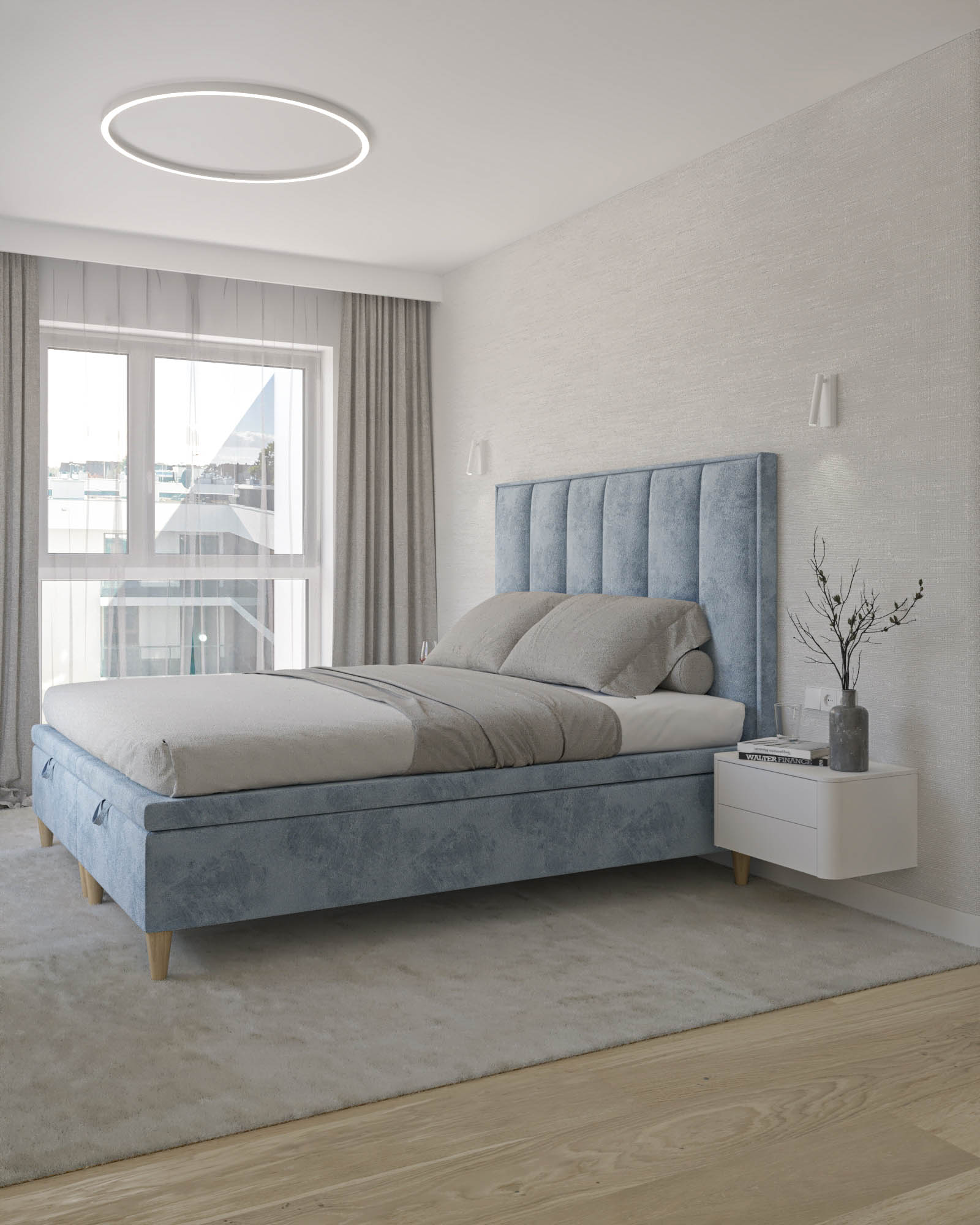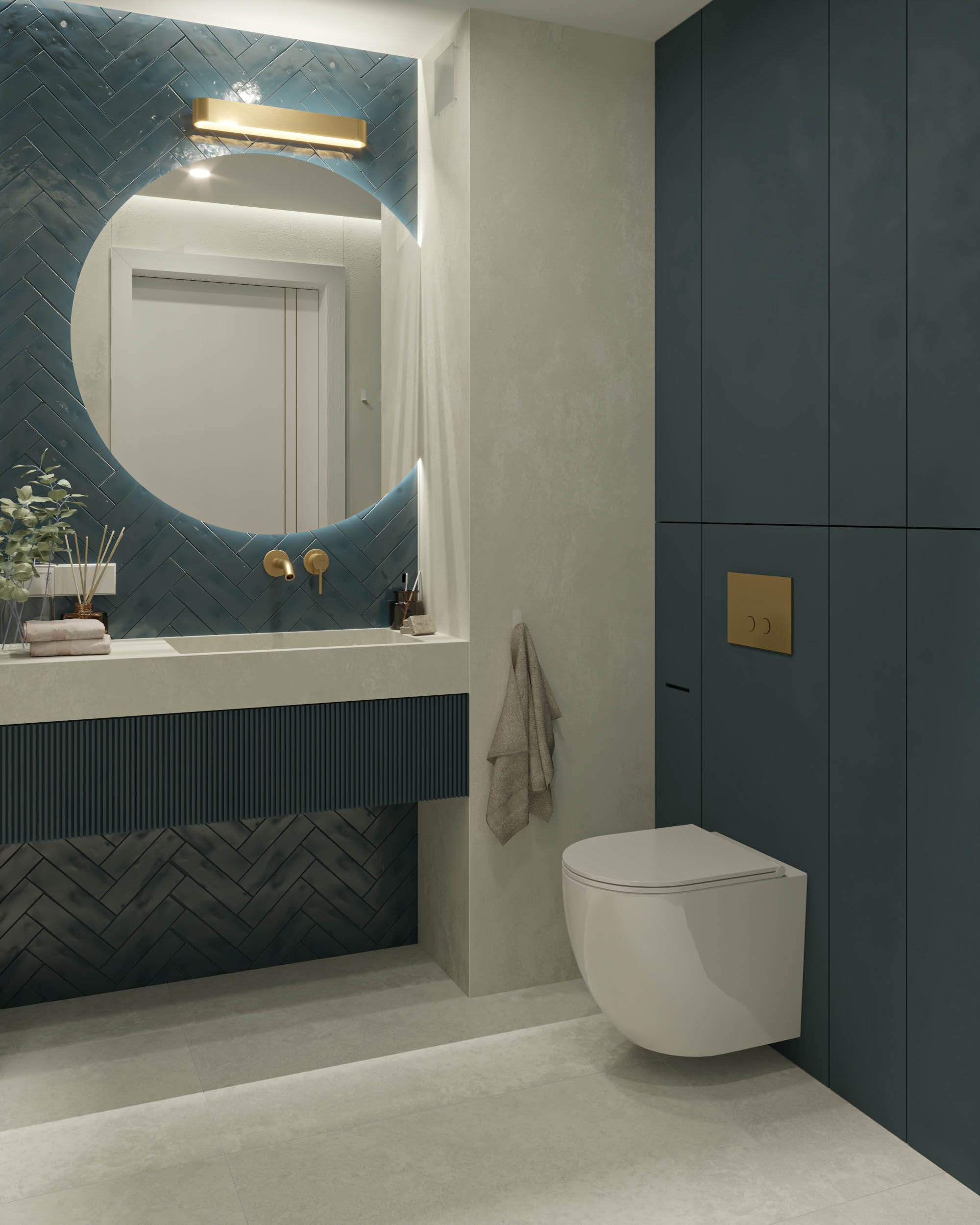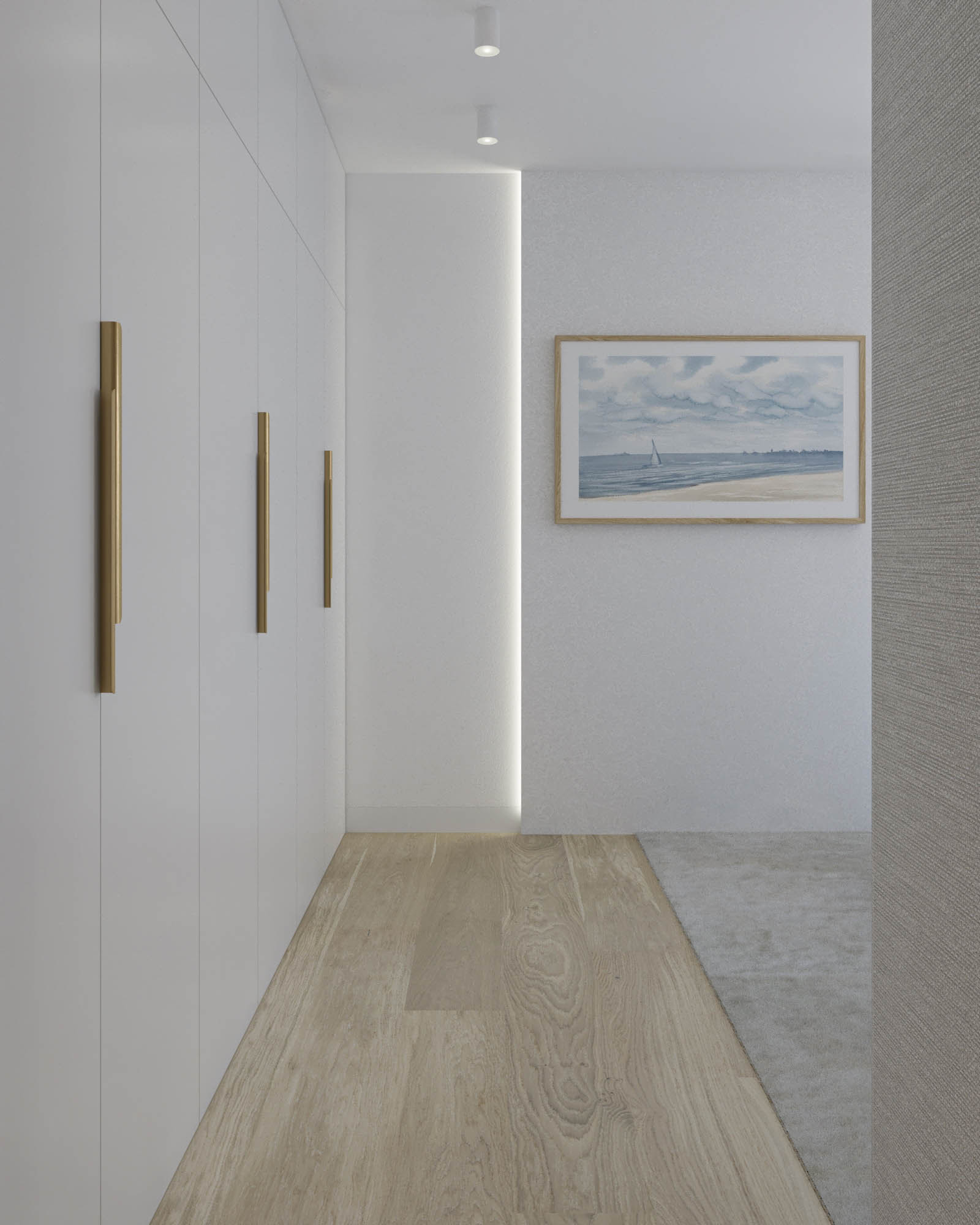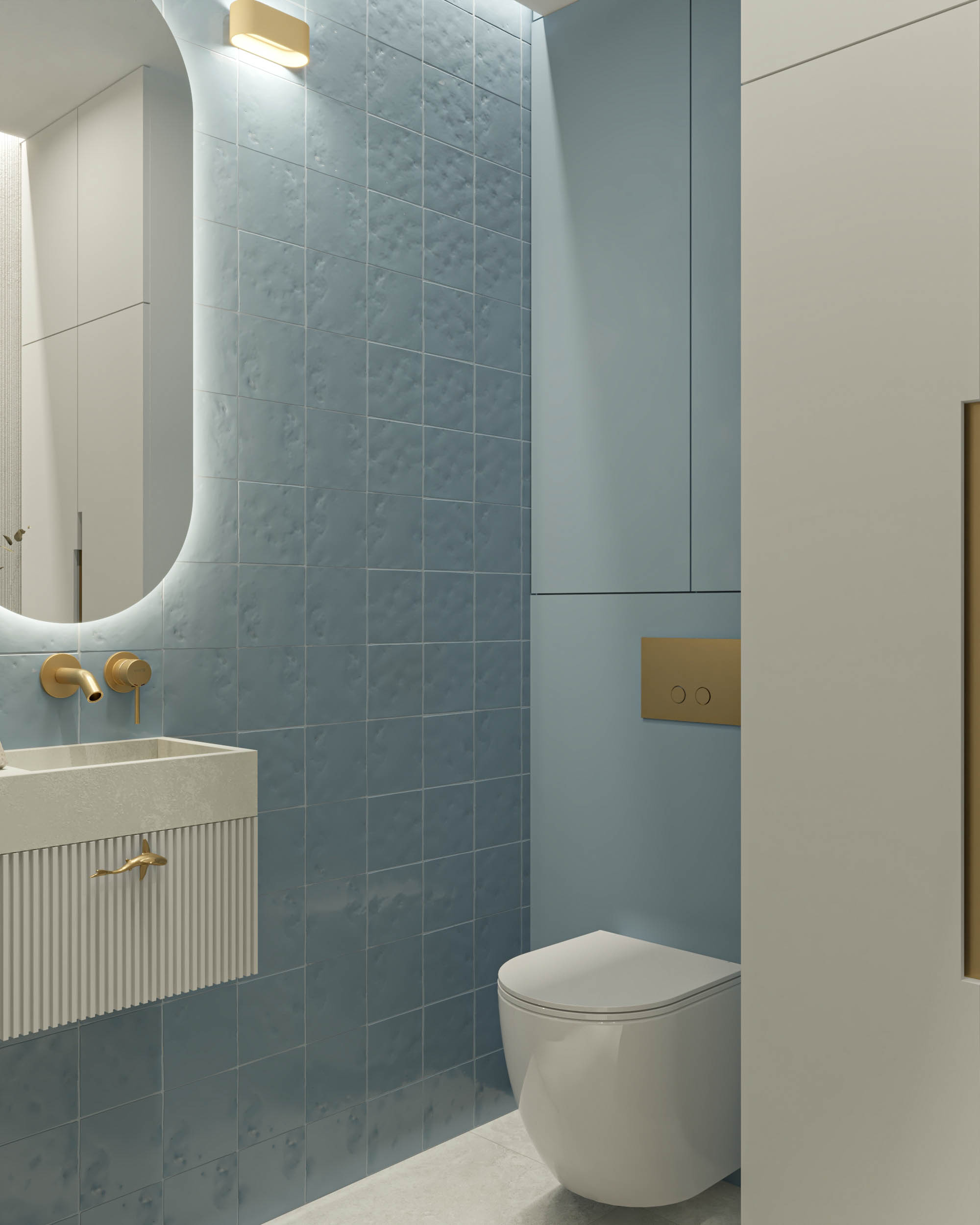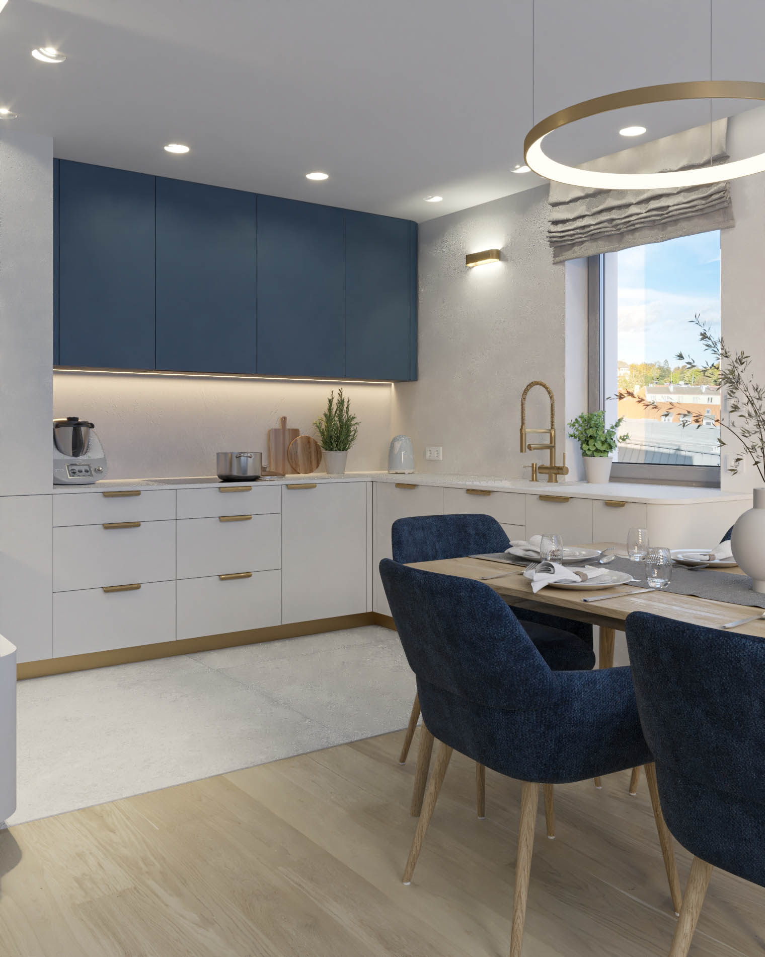 Mieszkanie zaprojektowano w nowoczesnym stylu, opartym na szlachetnych i trwałych materiałach. We wnętrzu zastosowano konglomerat kwarcowy, naturalne drewno na podłodze oraz wysokiej jakości włoską armaturę, które wspólnie budują elegancki i dopracowany charakter przestrzeni. Kolorystyka bazuje na złamanych bielach, ciepłych beżach i odcieniach błękitu oraz granatu. Ta spokojna paleta barw subtelnie nawiązuje do marynistycznego klimatu, wprowadzając do wnętrza świeżość i lekkość. Istotnym motywem kompozycyjnym są miękkie zaoblenia – widoczne w zabudowach stolarskich, lustrach i detalach mebli. Łagodzą one geometryczną prostotę brył, nadając wnętrzu lekkości i płynności. Całość łączy funkcjonalność z elegancją, tworząc harmonijną przestrzeń o wyraźnie dopracowanym, współczesnym charakterze.