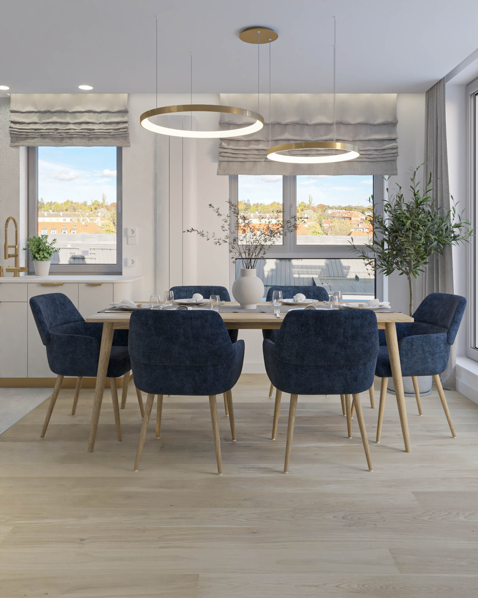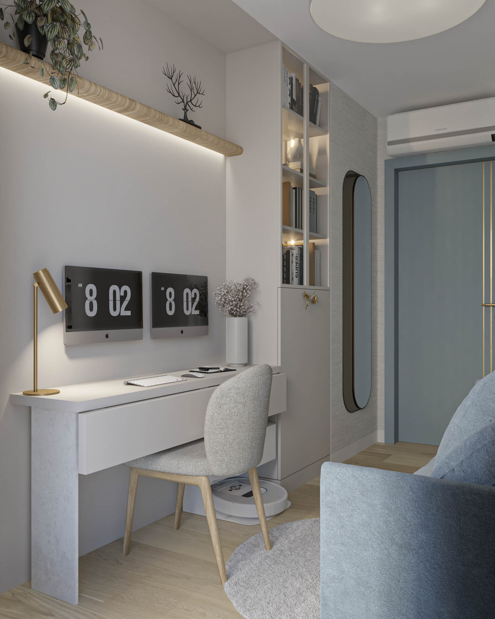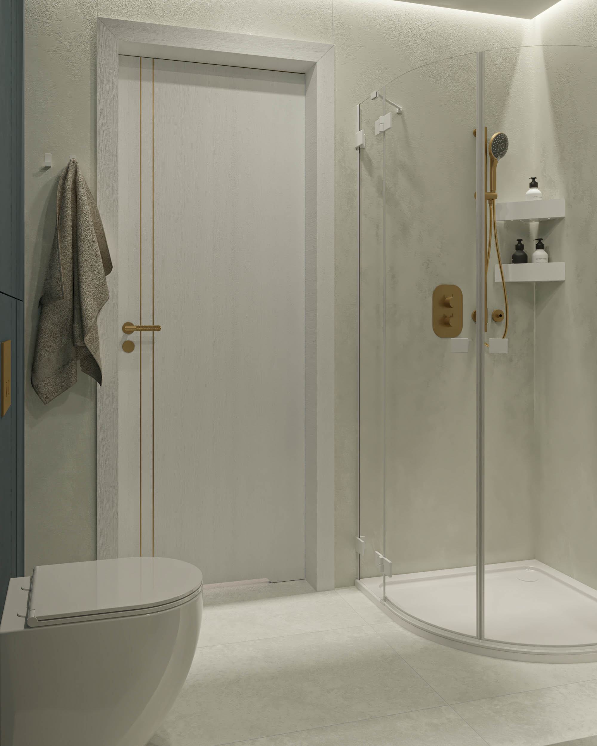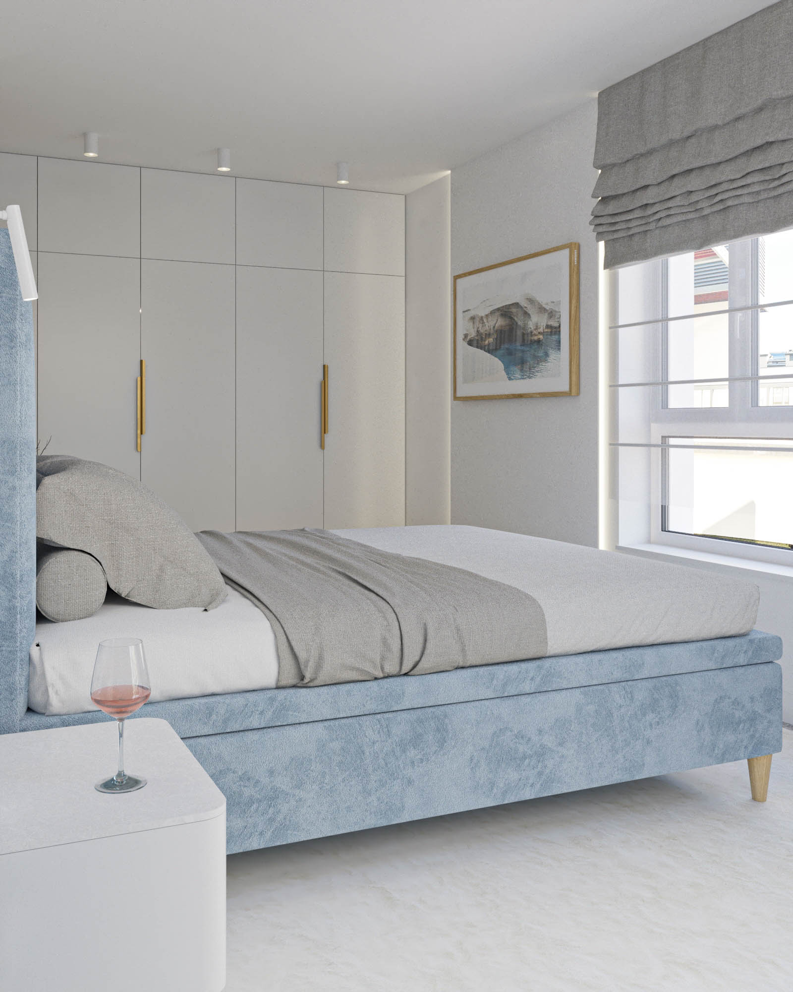 Mieszkanie zaprojektowano w nowoczesnym stylu, opartym na szlachetnych i trwałych materiałach. We wnętrzu zastosowano konglomerat kwarcowy, naturalne drewno na podłodze oraz wysokiej jakości włoską armaturę, które wspólnie budują elegancki i dopracowany charakter przestrzeni. Kolorystyka bazuje na złamanych bielach, ciepłych beżach i odcieniach błękitu oraz granatu. Ta spokojna paleta barw subtelnie nawiązuje do marynistycznego klimatu, wprowadzając do wnętrza świeżość i lekkość. Istotnym motywem kompozycyjnym są miękkie zaoblenia – widoczne w zabudowach stolarskich, lustrach i detalach mebli. Łagodzą one geometryczną prostotę brył, nadając wnętrzu lekkości i płynności. Całość łączy funkcjonalność z elegancją, tworząc harmonijną przestrzeń o wyraźnie dopracowanym, współczesnym charakterze.