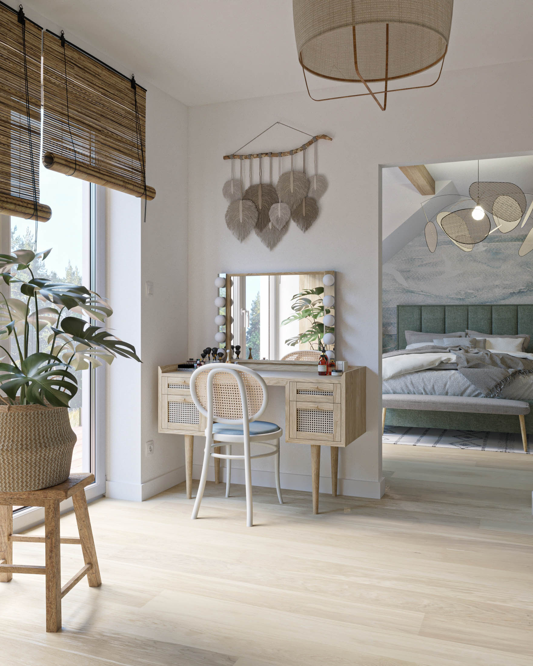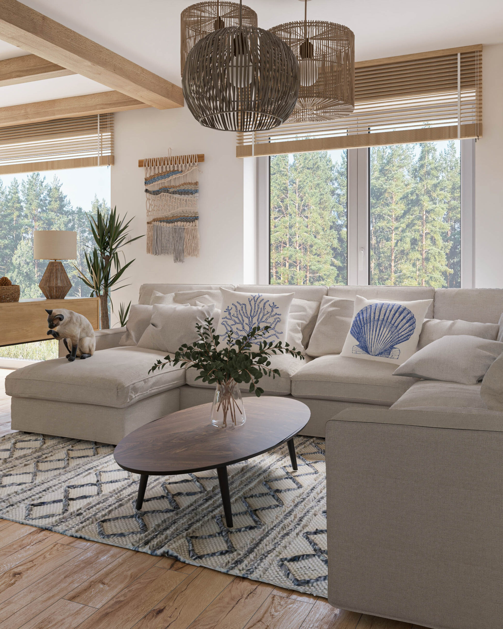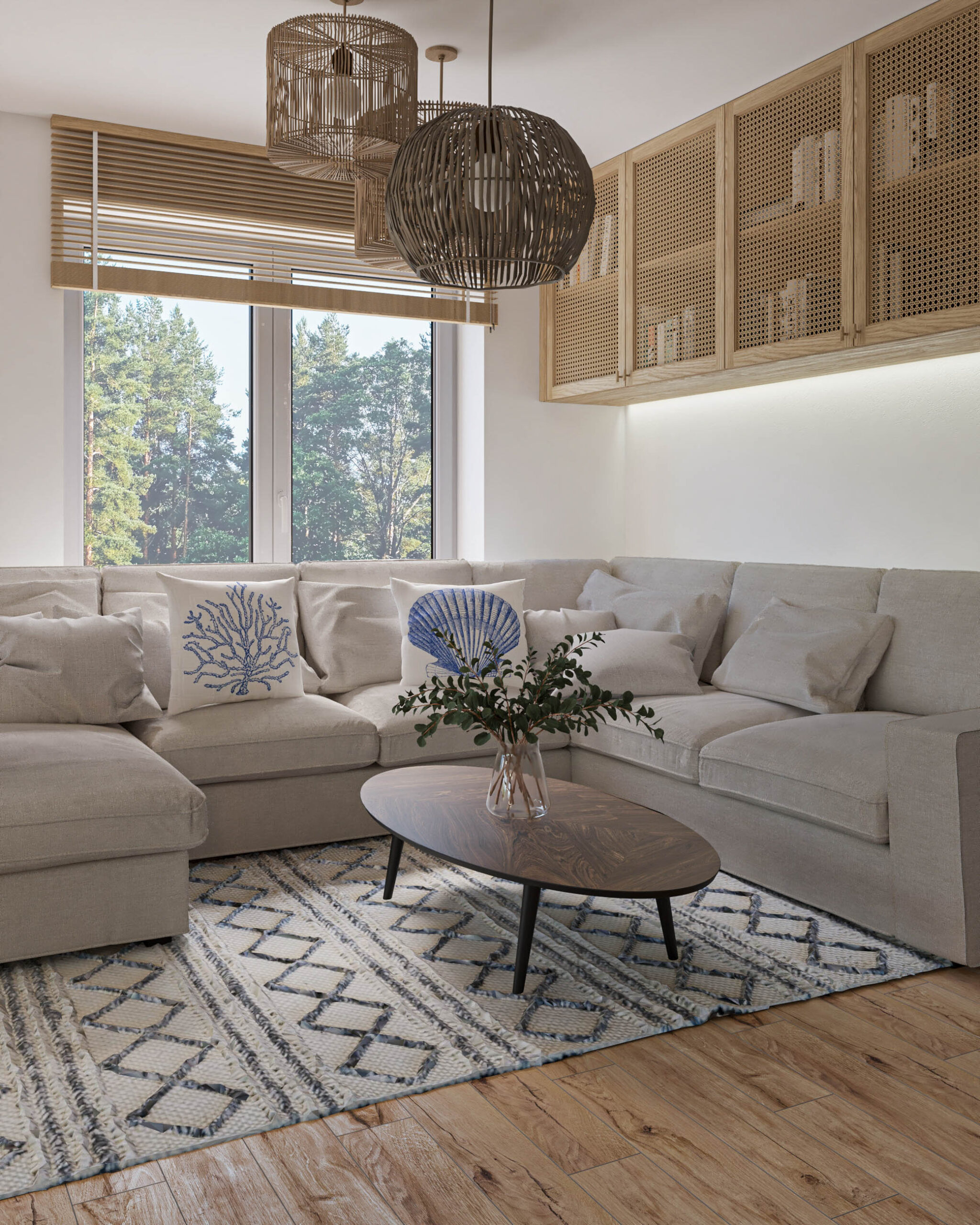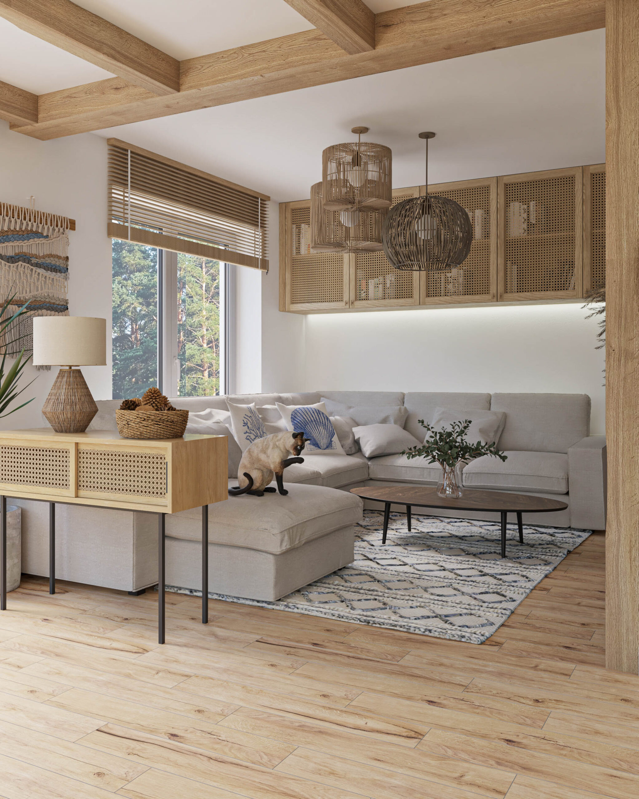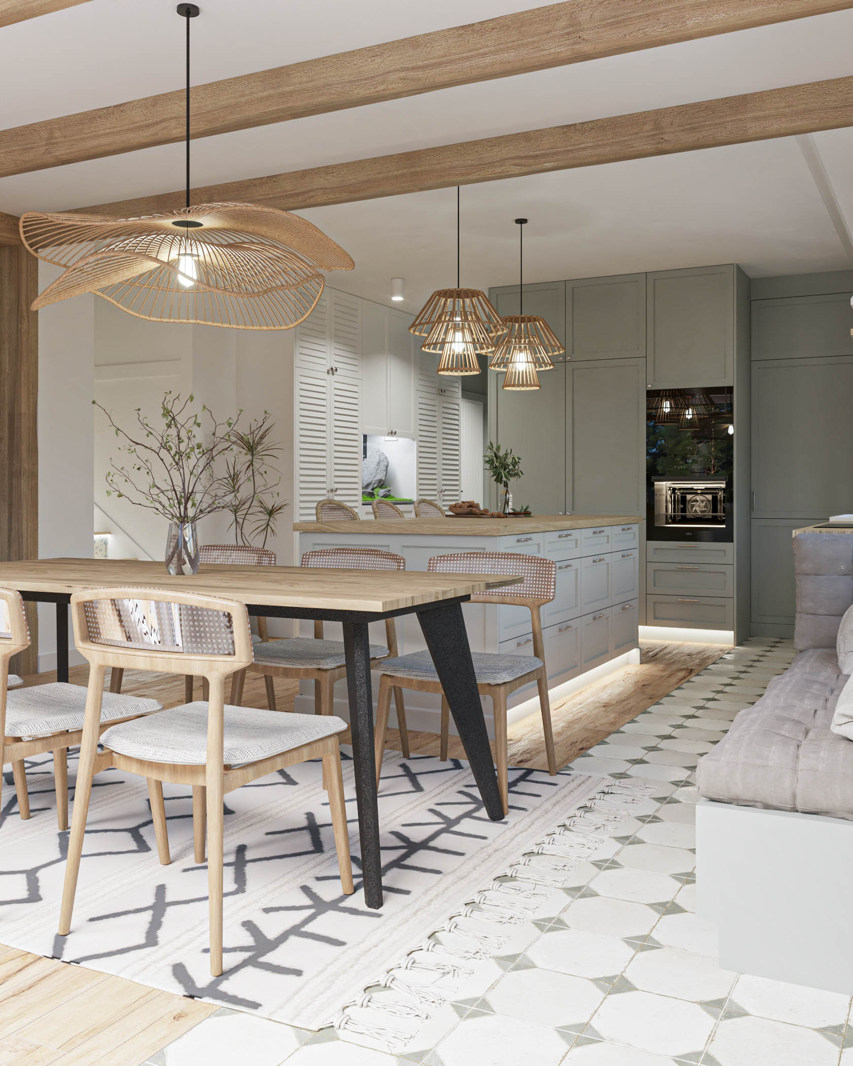 Dom został zaprojektowany w stylu śródziemnomorskim, przełamany lekkością i naturalnością estetyki boho. Jasna, naturalna paleta barw – beże, złamane biele, szałwiowa zieleń i przygaszone błękity – buduje spokojną, harmonijną atmosferę inspirowaną naturą i nadmorskim krajobrazem. Drewno, rattan, plecionki i miękkie tkaniny nadają przestrzeni ciepło oraz przytulność, a powtarzalność materiałów w całym domu zapewnia spójność kompozycji. To elegancki, ale swobodny dom, w którym nowoczesność łączy się z wakacyjną lekkością.