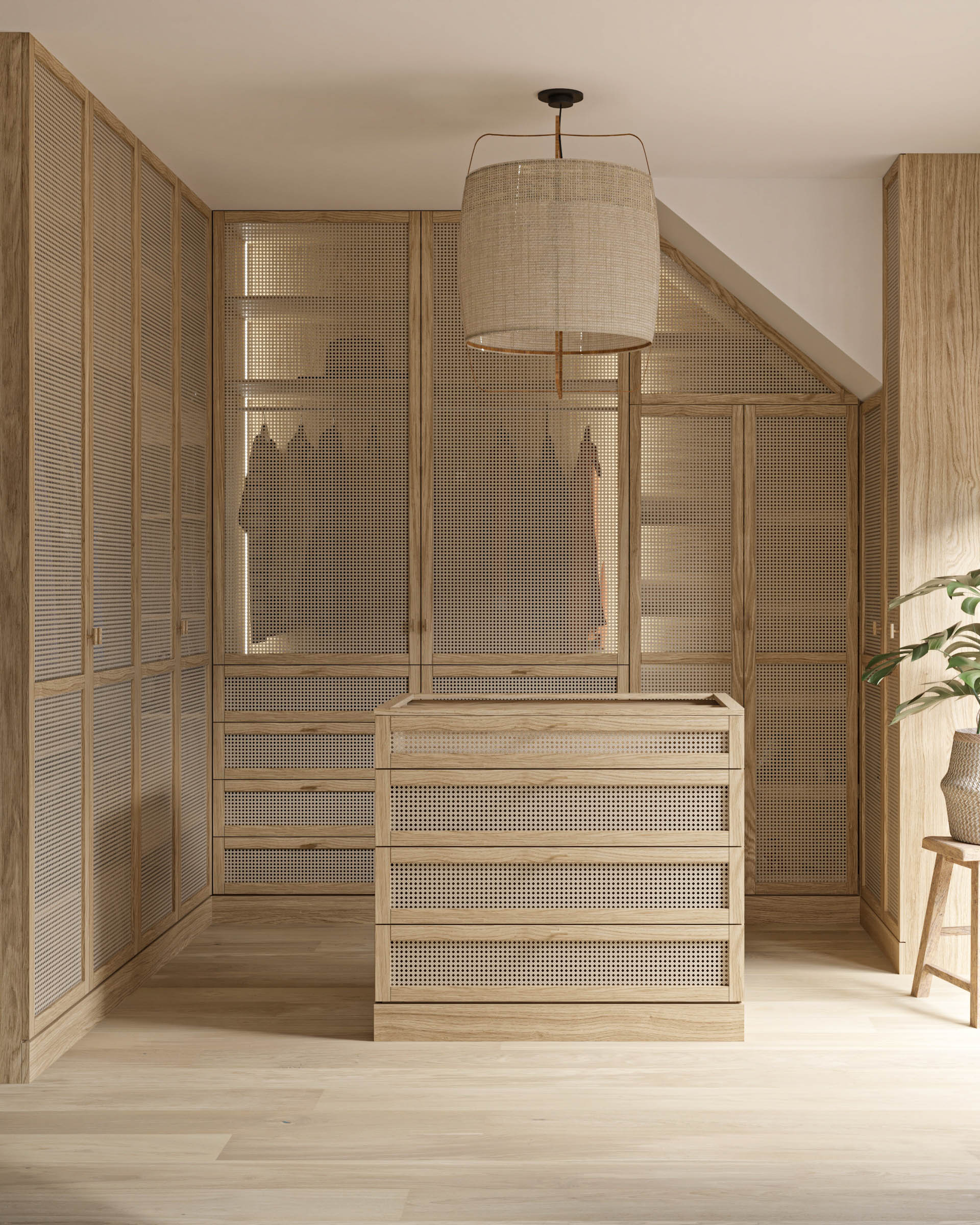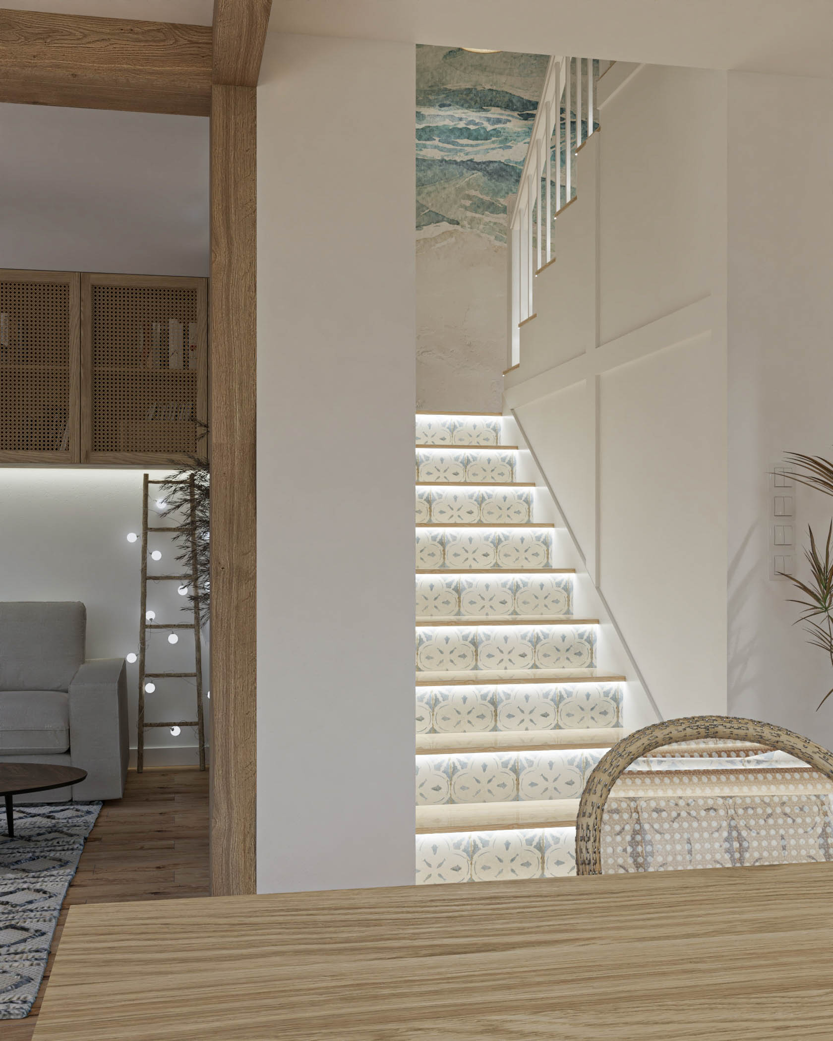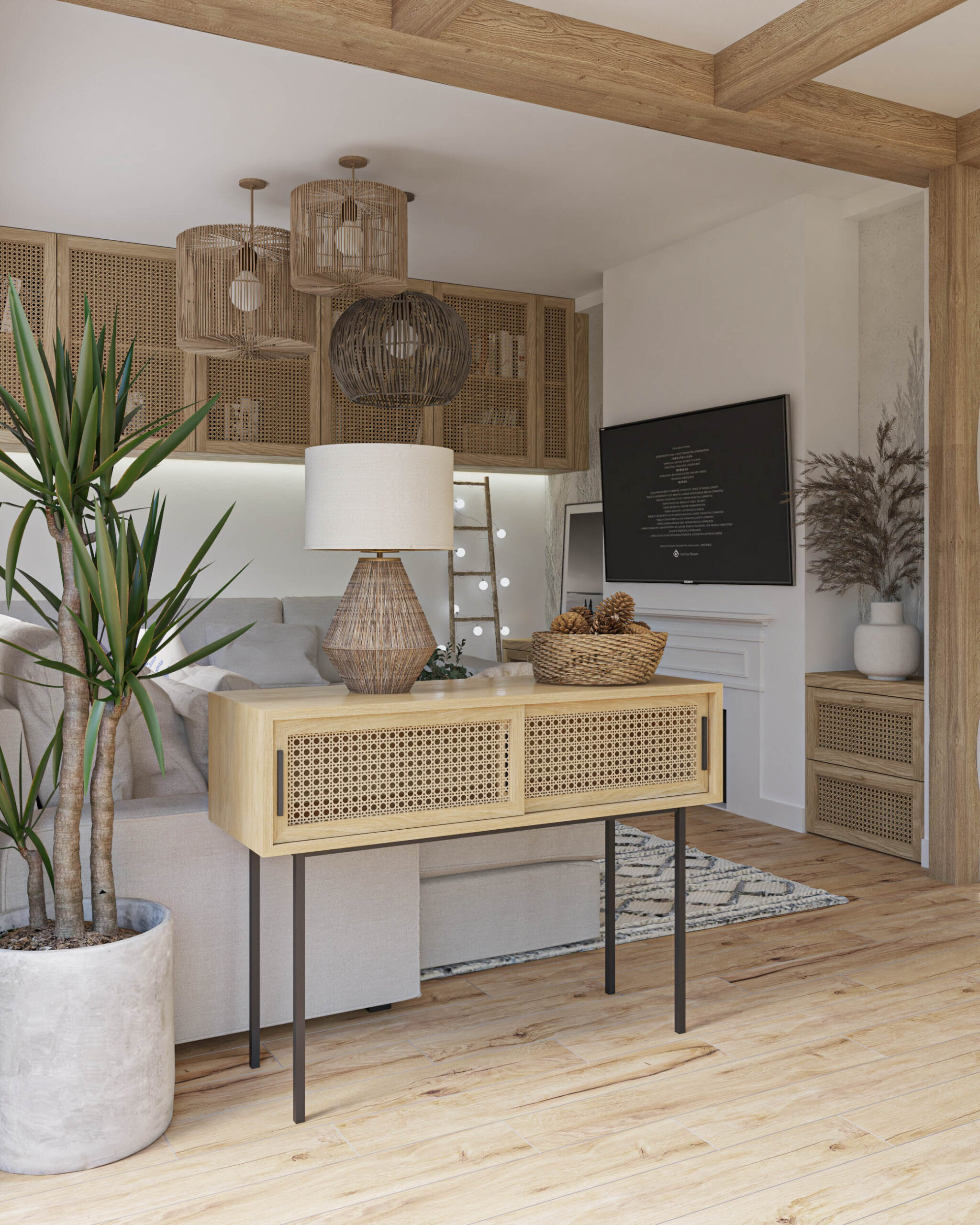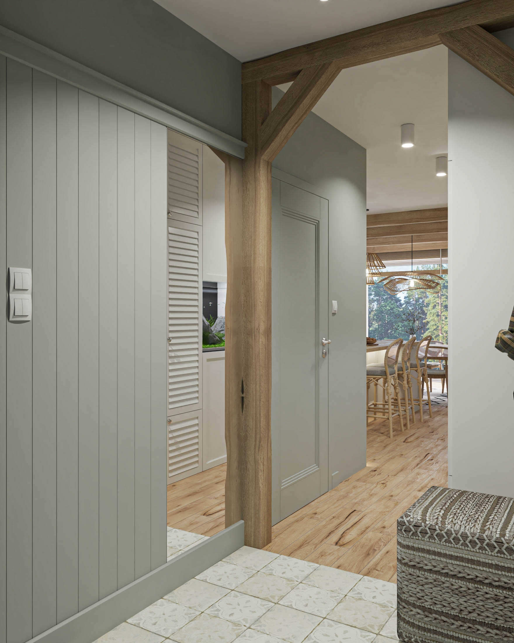 Dom został zaprojektowany w stylu śródziemnomorskim, przełamany lekkością i naturalnością estetyki boho. Jasna, naturalna paleta barw – beże, złamane biele, szałwiowa zieleń i przygaszone błękity – buduje spokojną, harmonijną atmosferę inspirowaną naturą i nadmorskim krajobrazem. Drewno, rattan, plecionki i miękkie tkaniny nadają przestrzeni ciepło oraz przytulność, a powtarzalność materiałów w całym domu zapewnia spójność kompozycji. To elegancki, ale swobodny dom, w którym nowoczesność łączy się z wakacyjną lekkością.