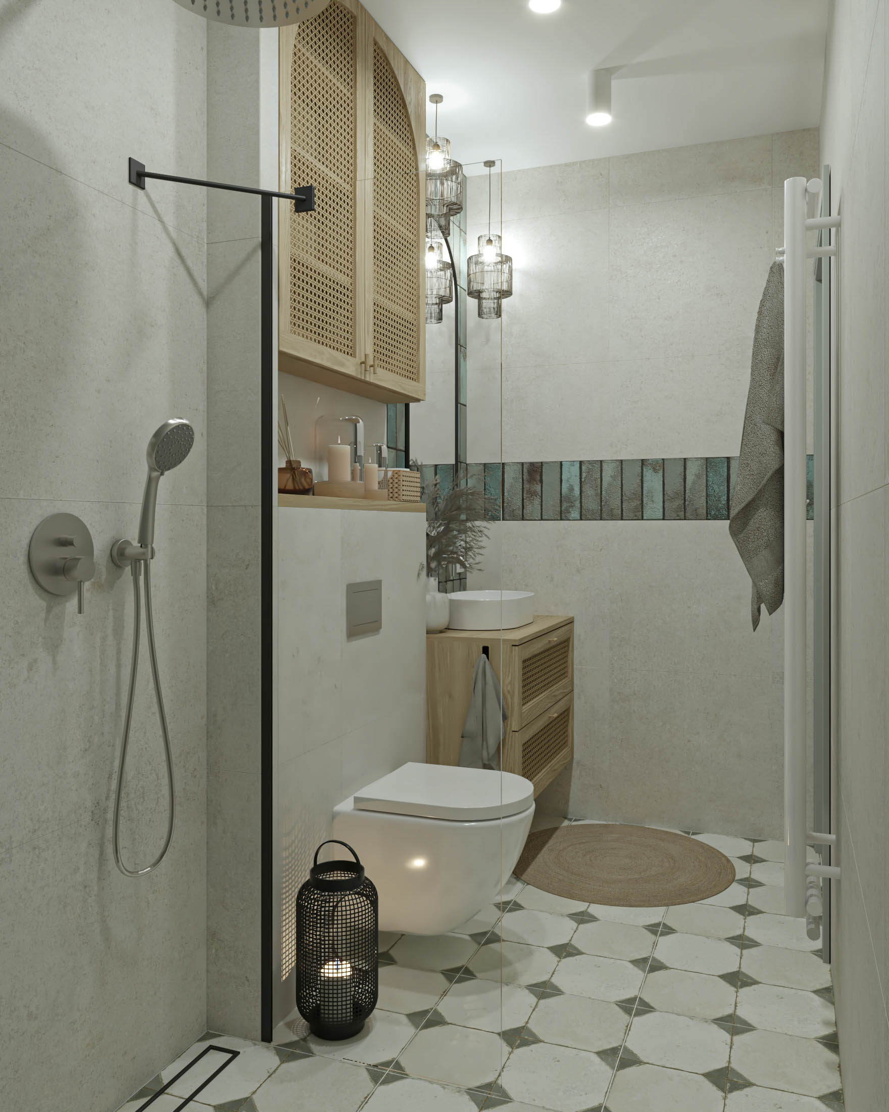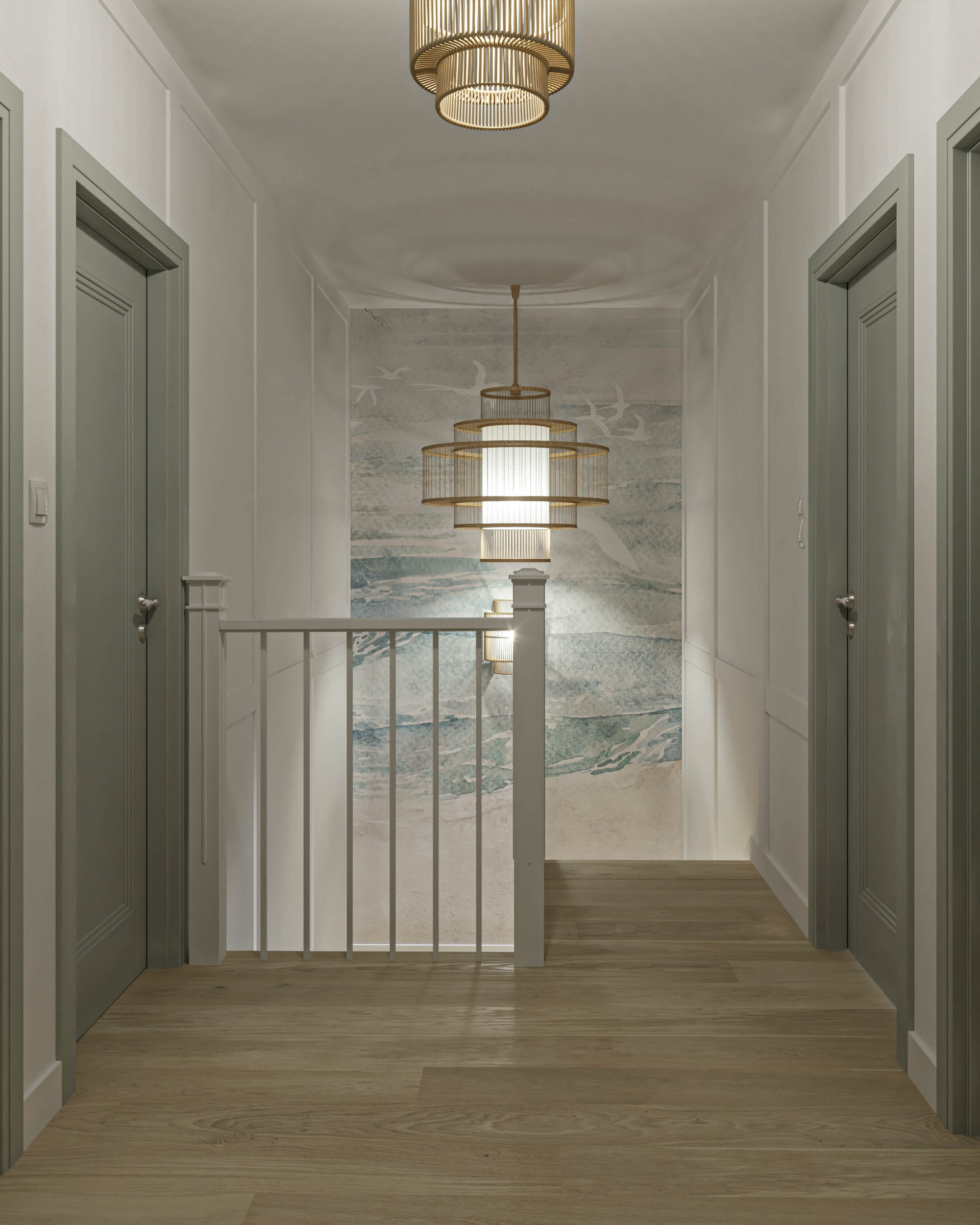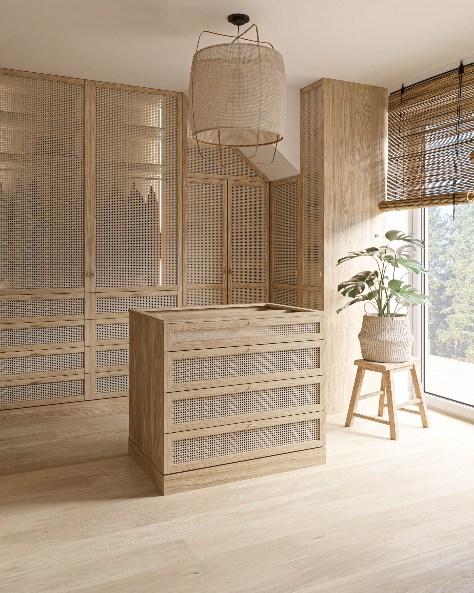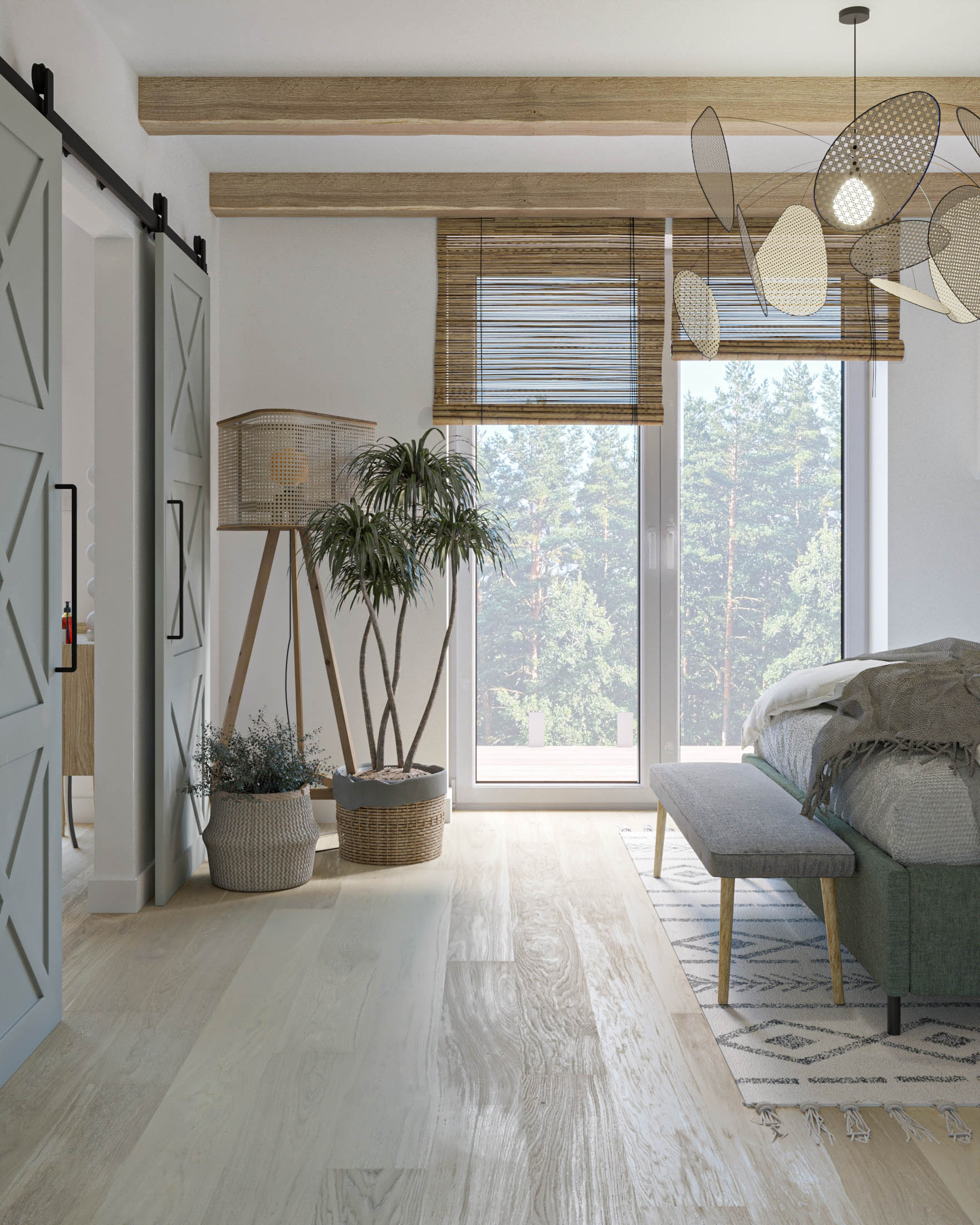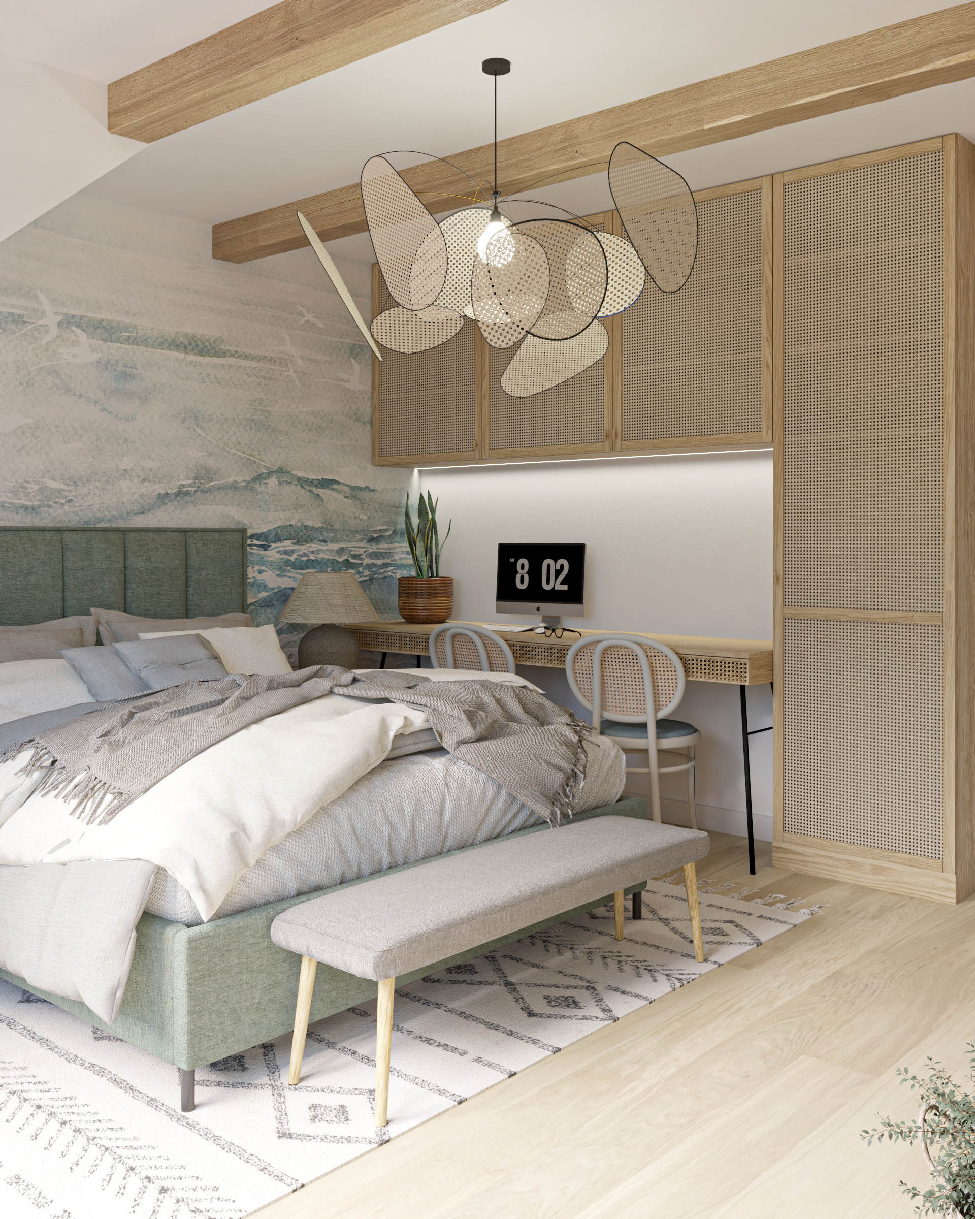 Dom został zaprojektowany w stylu śródziemnomorskim, przełamany lekkością i naturalnością estetyki boho. Jasna, naturalna paleta barw – beże, złamane biele, szałwiowa zieleń i przygaszone błękity – buduje spokojną, harmonijną atmosferę inspirowaną naturą i nadmorskim krajobrazem. Drewno, rattan, plecionki i miękkie tkaniny nadają przestrzeni ciepło oraz przytulność, a powtarzalność materiałów w całym domu zapewnia spójność kompozycji. To elegancki, ale swobodny dom, w którym nowoczesność łączy się z wakacyjną lekkością.