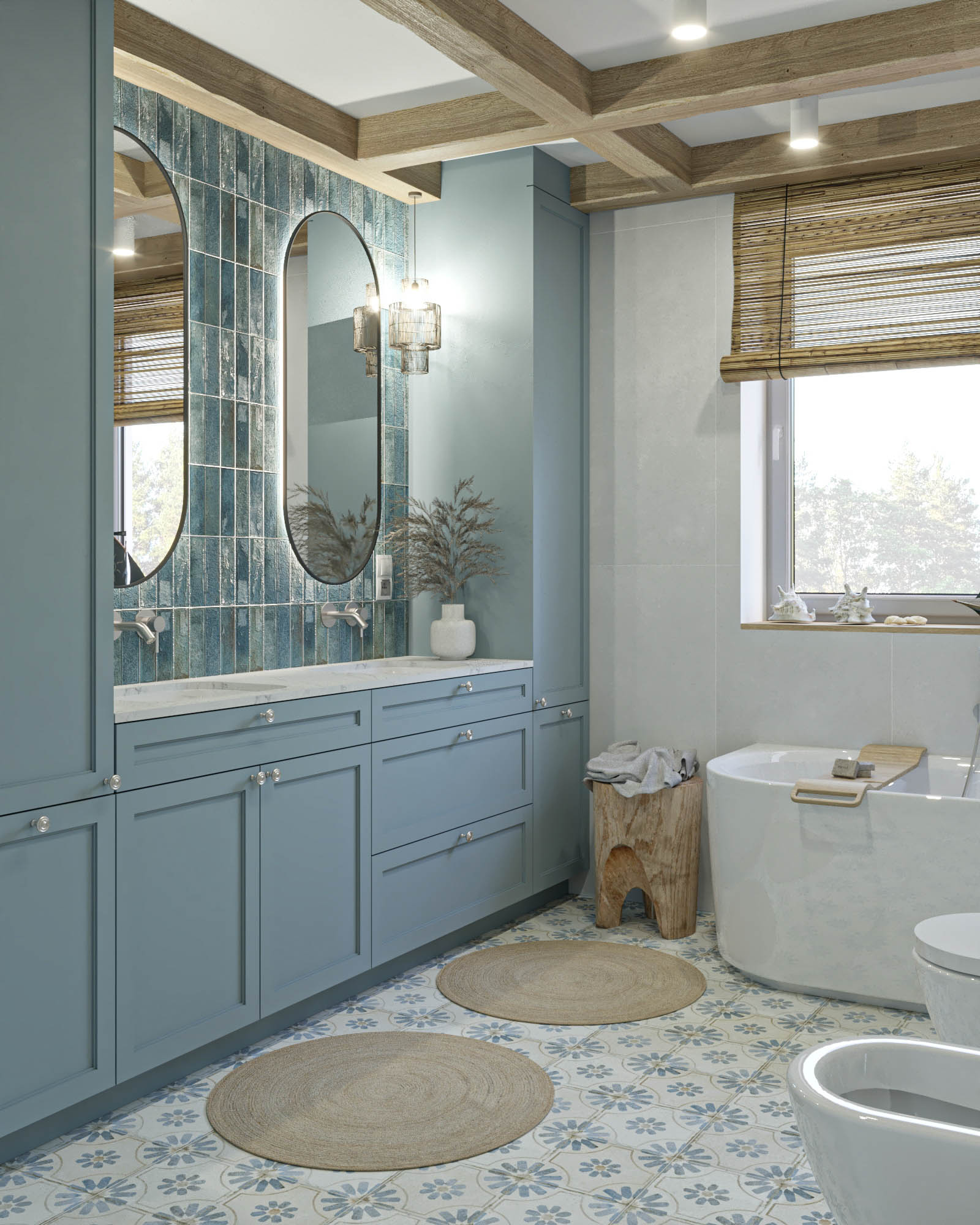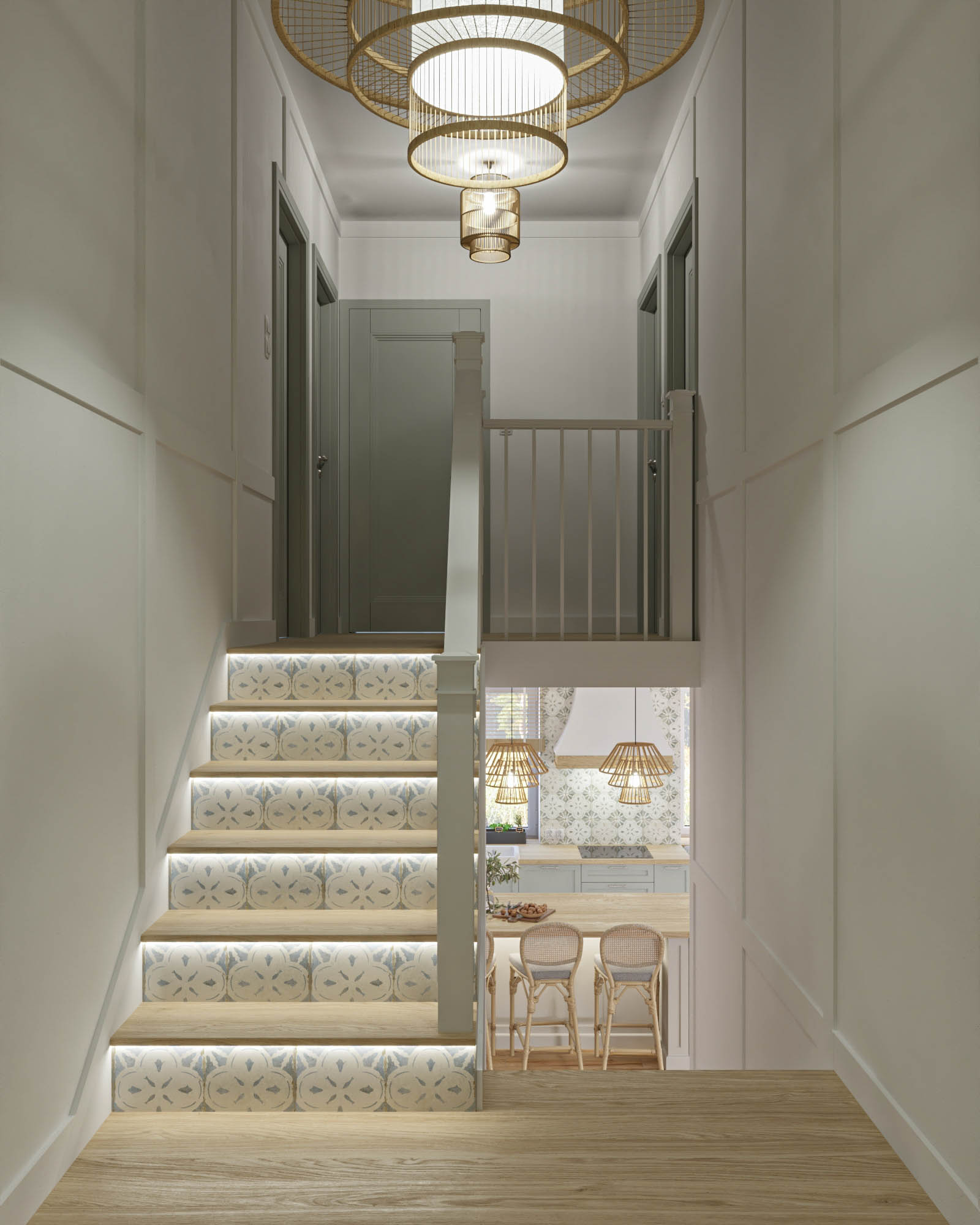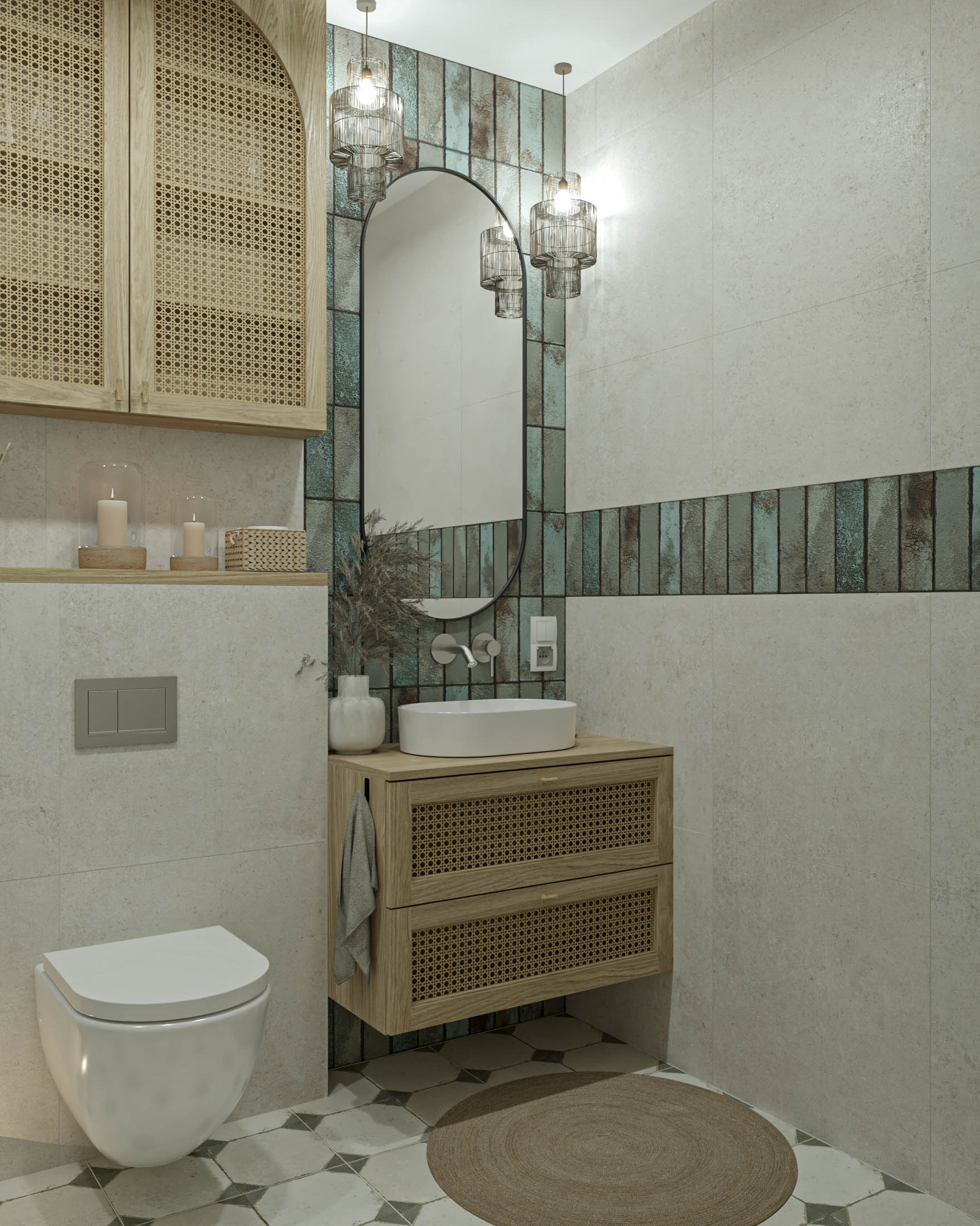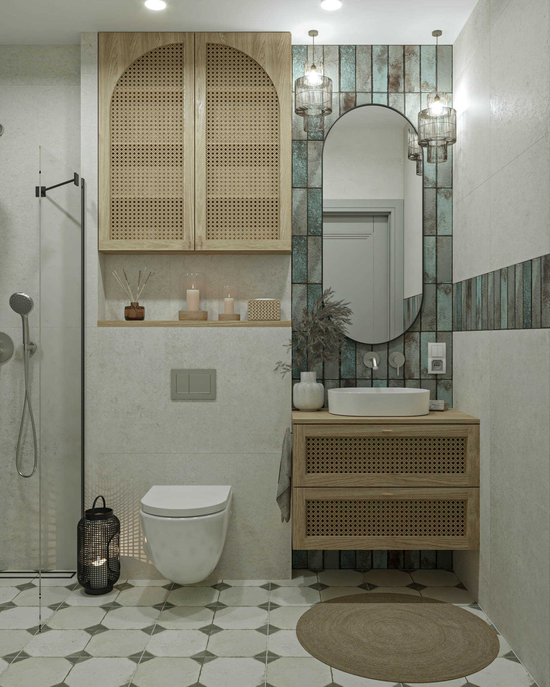 Dom został zaprojektowany w stylu śródziemnomorskim, przełamany lekkością i naturalnością estetyki boho. Jasna, naturalna paleta barw – beże, złamane biele, szałwiowa zieleń i przygaszone błękity – buduje spokojną, harmonijną atmosferę inspirowaną naturą i nadmorskim krajobrazem. Drewno, rattan, plecionki i miękkie tkaniny nadają przestrzeni ciepło oraz przytulność, a powtarzalność materiałów w całym domu zapewnia spójność kompozycji. To elegancki, ale swobodny dom, w którym nowoczesność łączy się z wakacyjną lekkością.