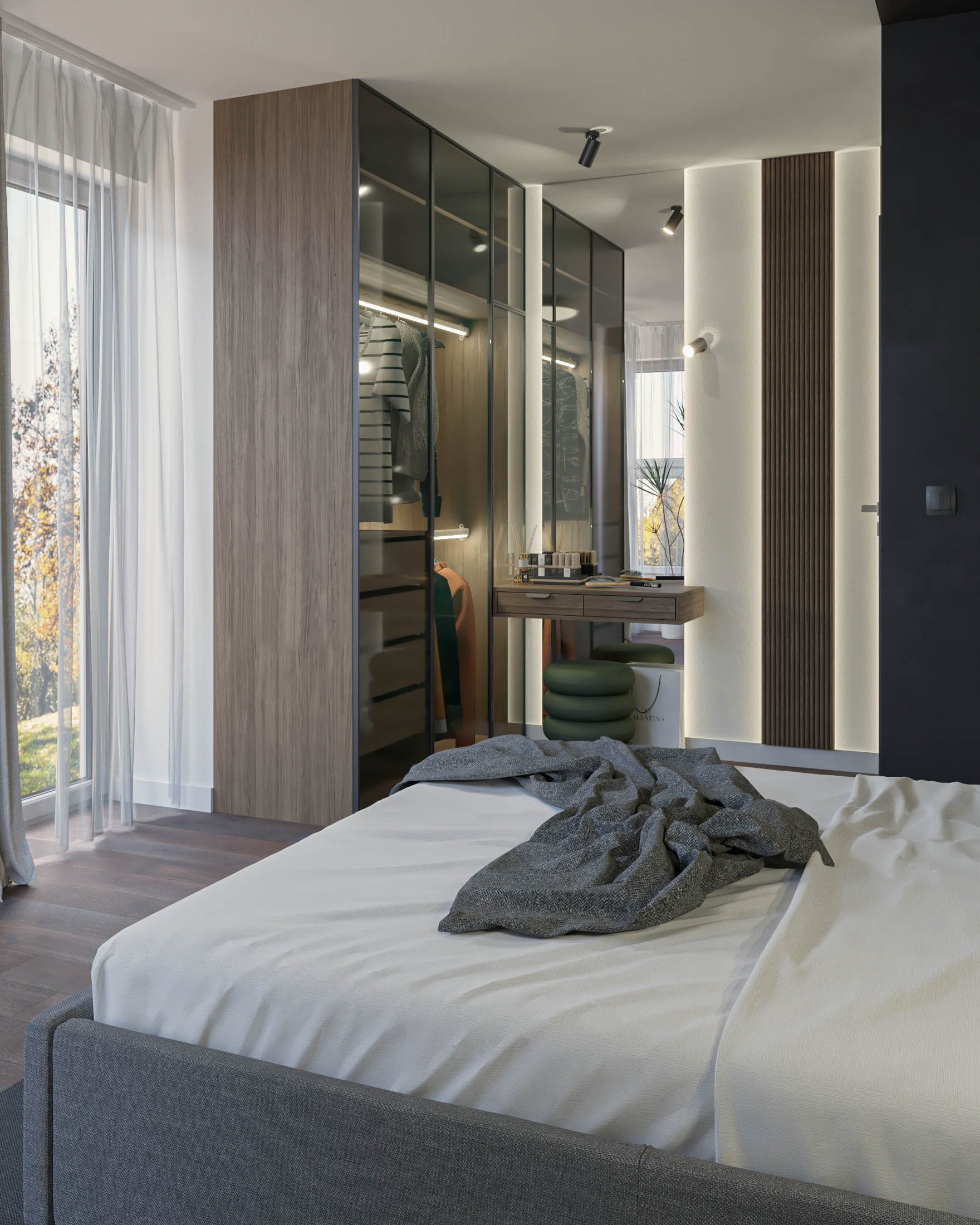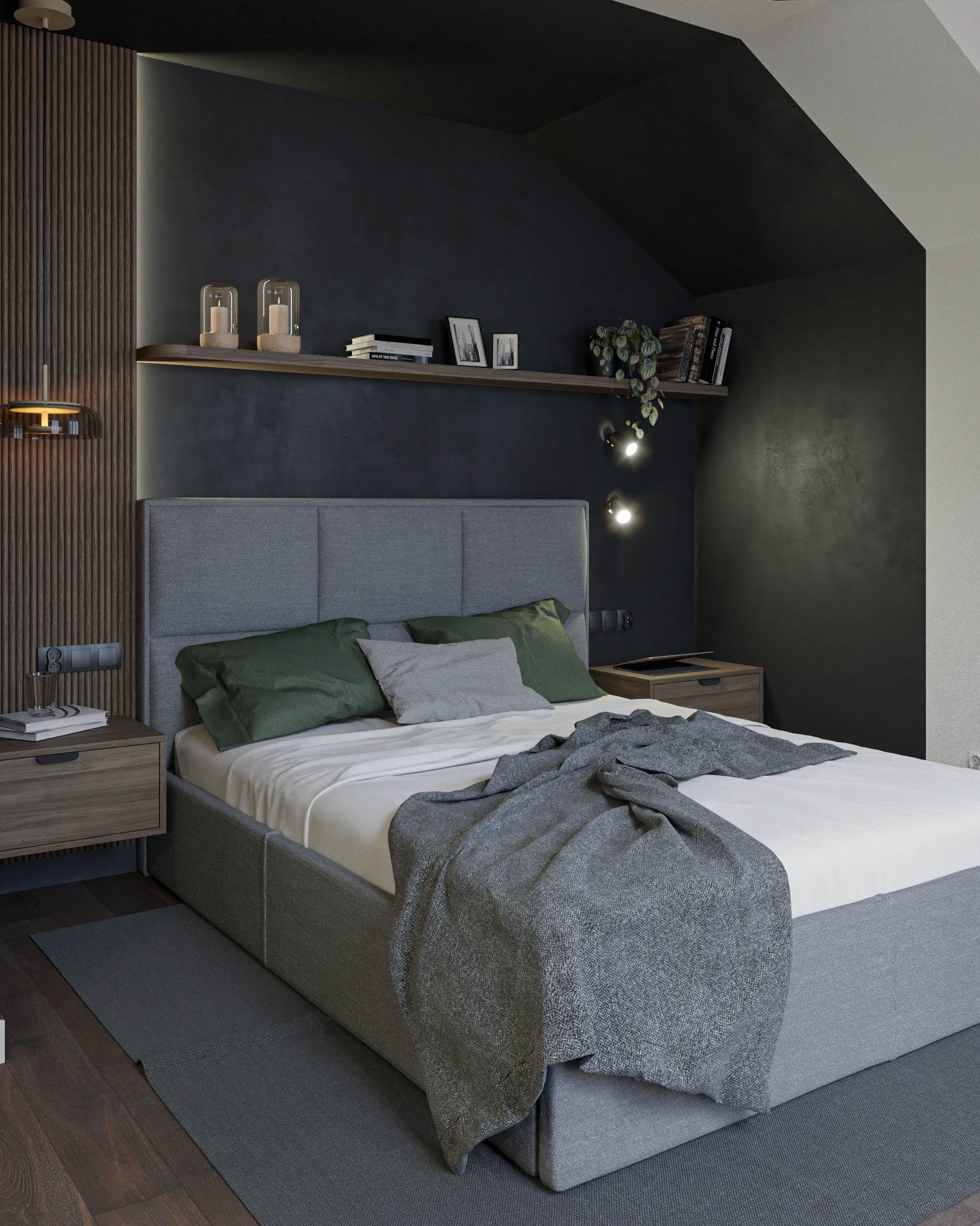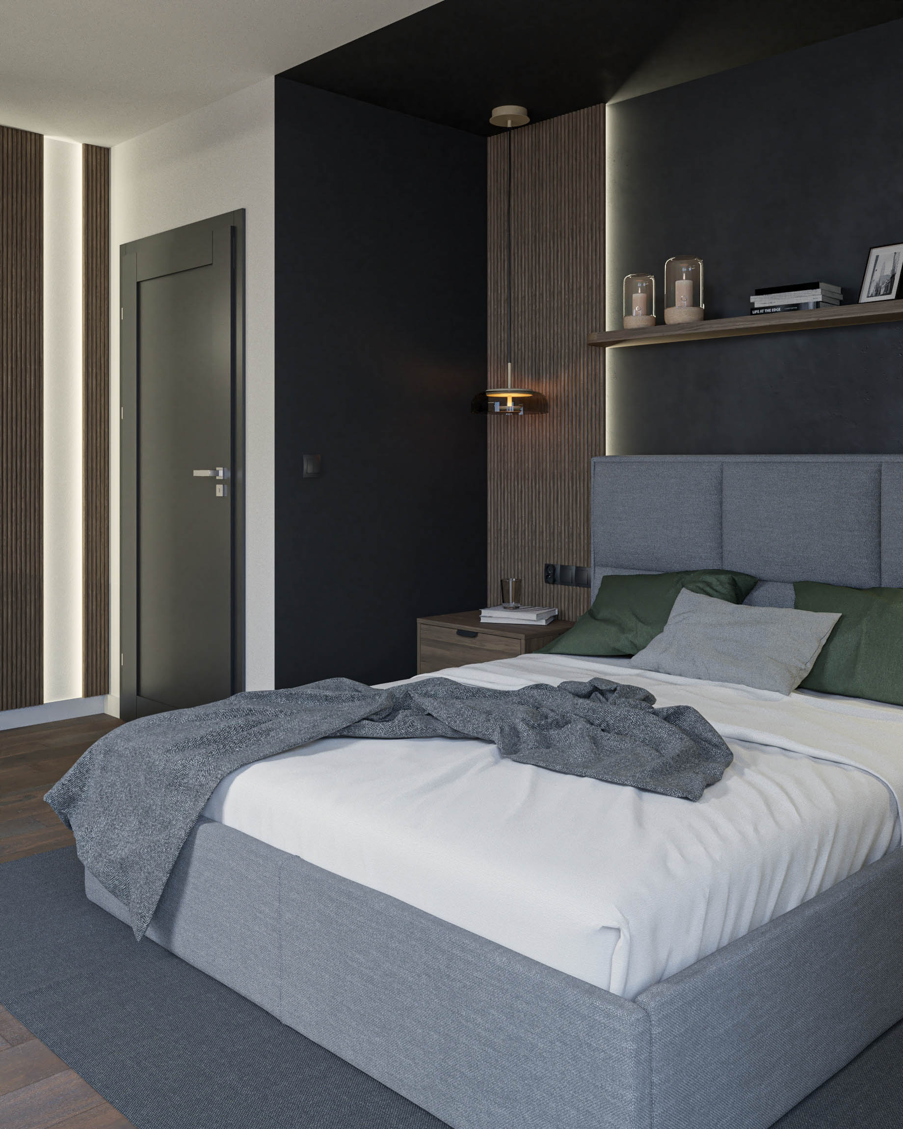 Sypialnia wraz z garderobą zostały zaprojektowane w stylu nowoczesnym. Głęboka, antracytowa ściana i sufit tworzą nastrojowe tło dla tapicerowanego łóżka w jasnoszarej tkaninie, a pionowe lamele z naturalnego drewna ocieplają kompozycję i nadają jej rytm. Klimat buduje subtelne, liniowe oświetlenie LED oraz punktowe kinkiety, które podkreślają strukturę materiałów i wprowadzają przytulną atmosferę.