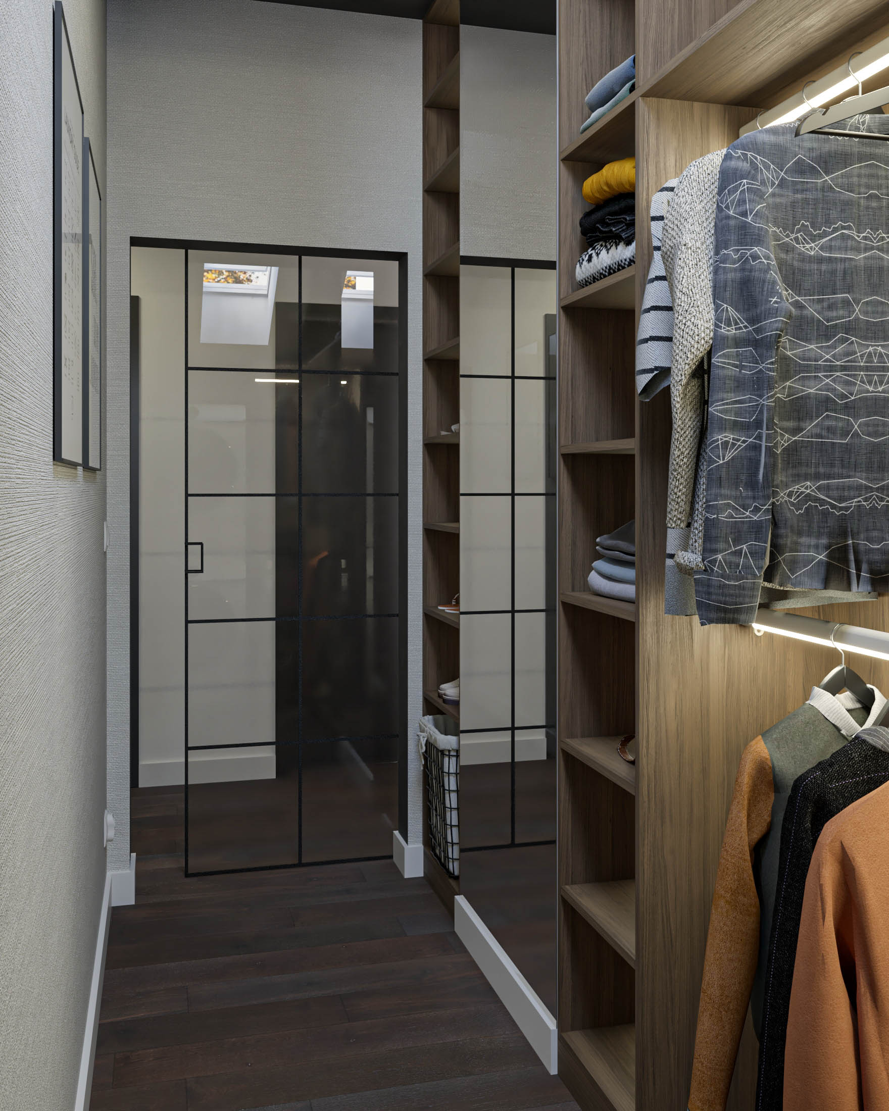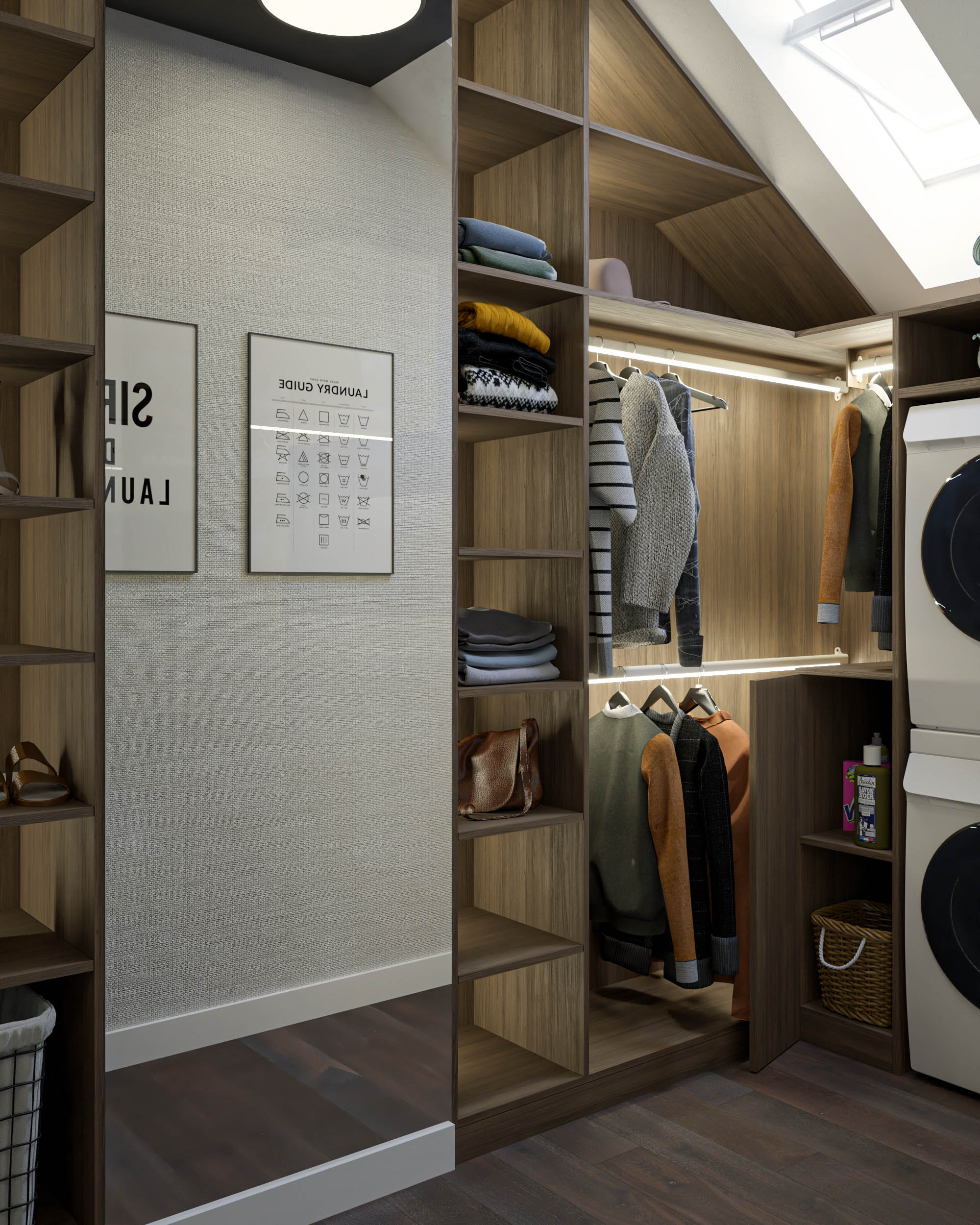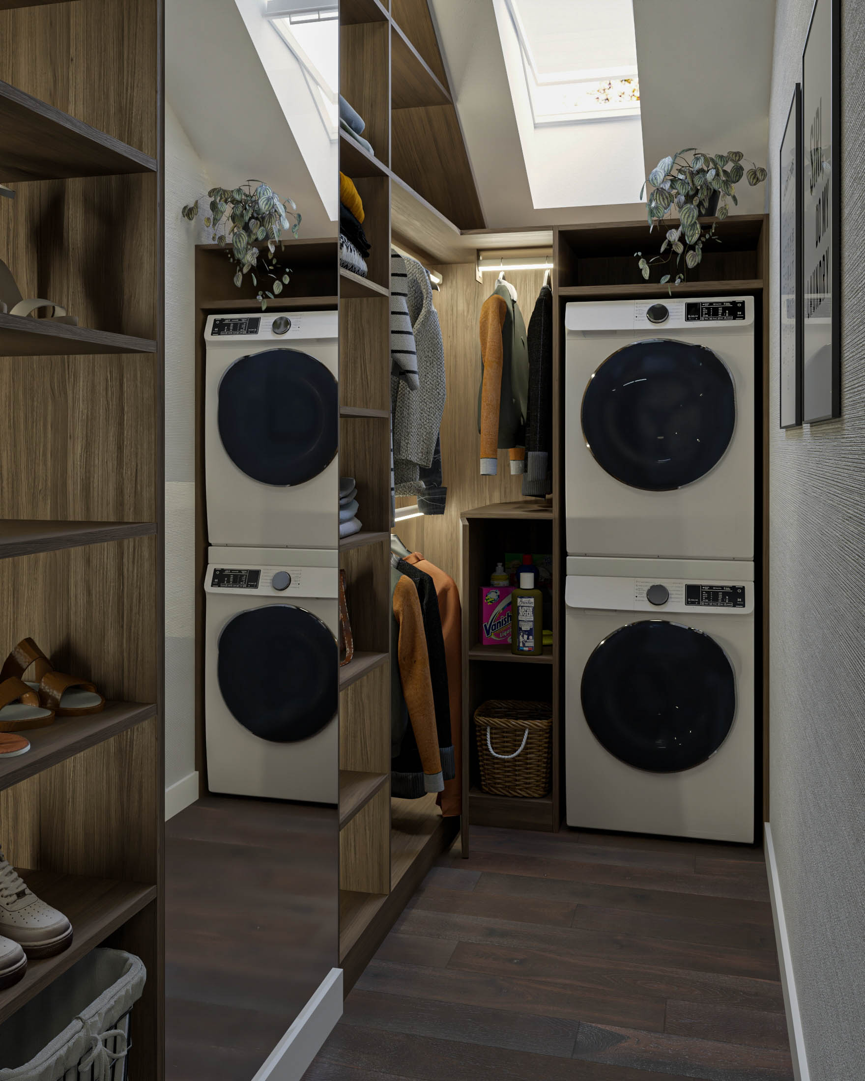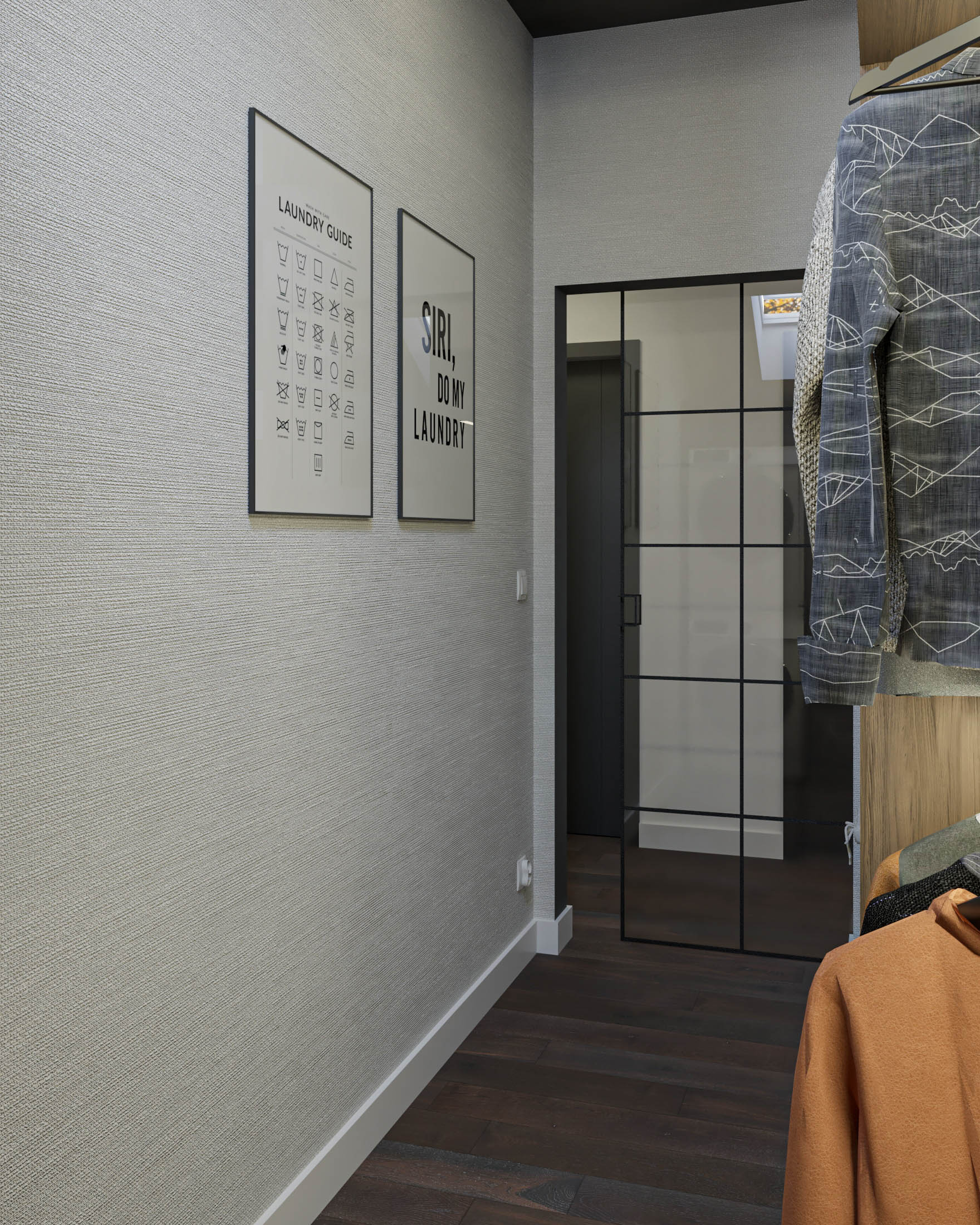 W garderobie dominuje zabudowa w dekorze ciemnego drewna. Przemyślane podświetlenia półek i drążków eksponują fakturę materiałów, a zintegrowana strefa pralni została dyskretnie wkomponowana w zabudowę, zachowując spójność estetyczną. Całość łączy funkcjonalność z wyrazistą, ale komfortową w odbiorze estetyką.