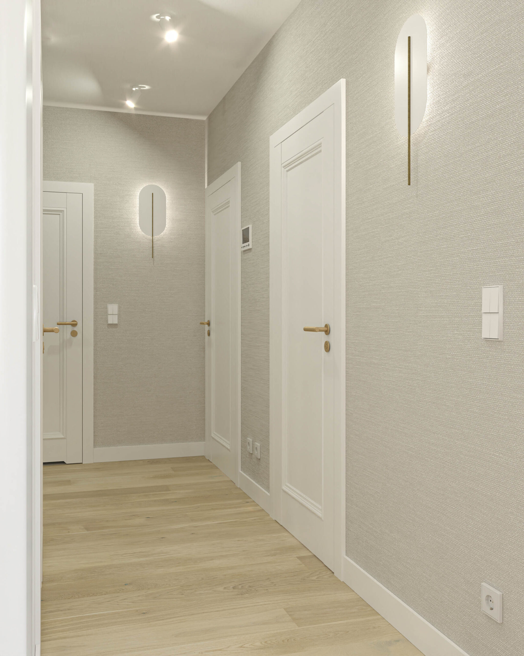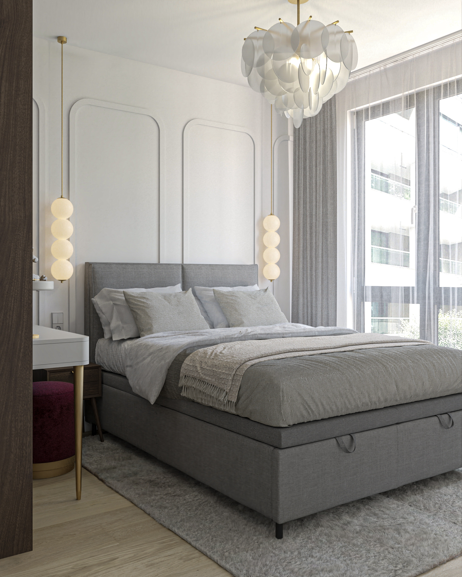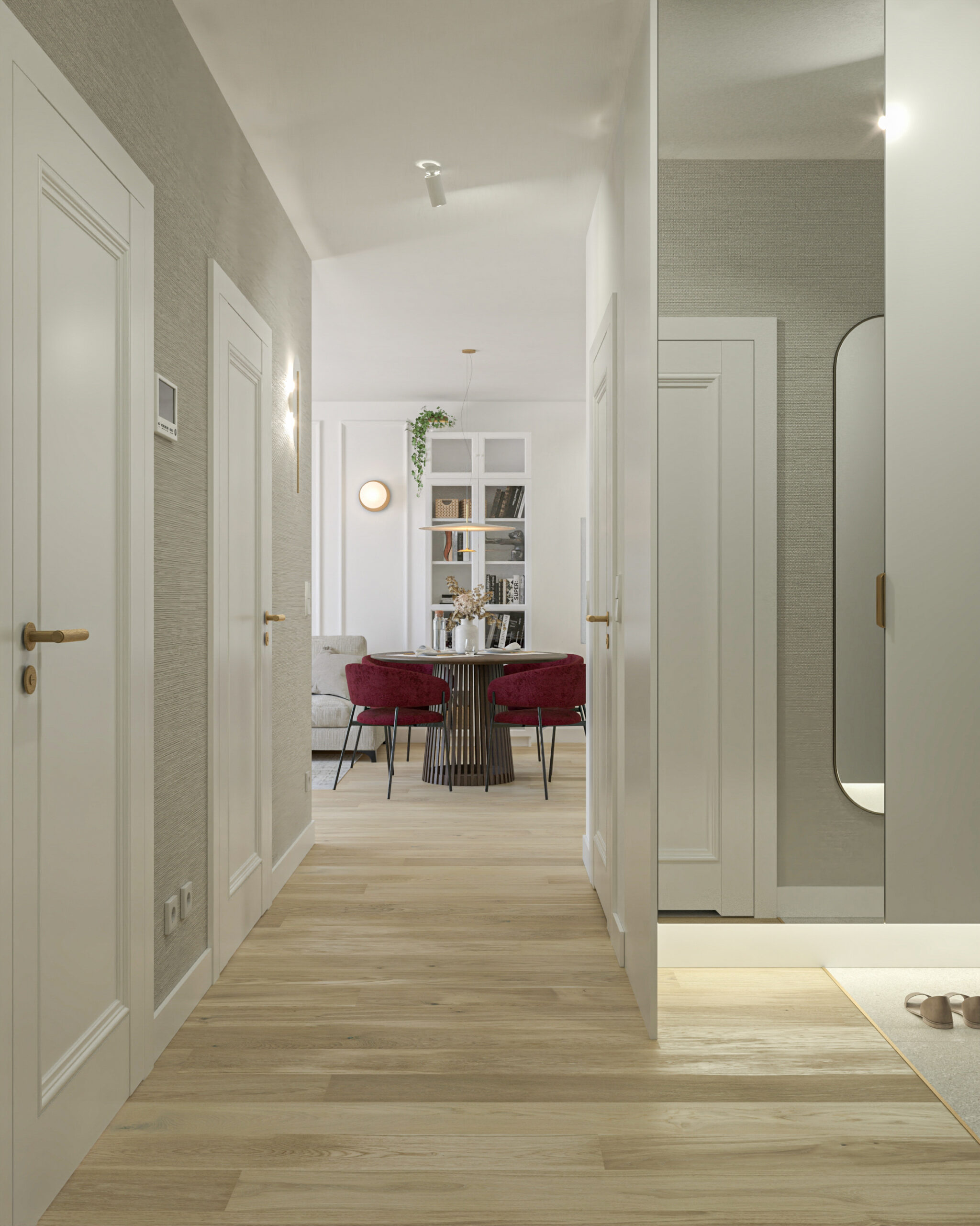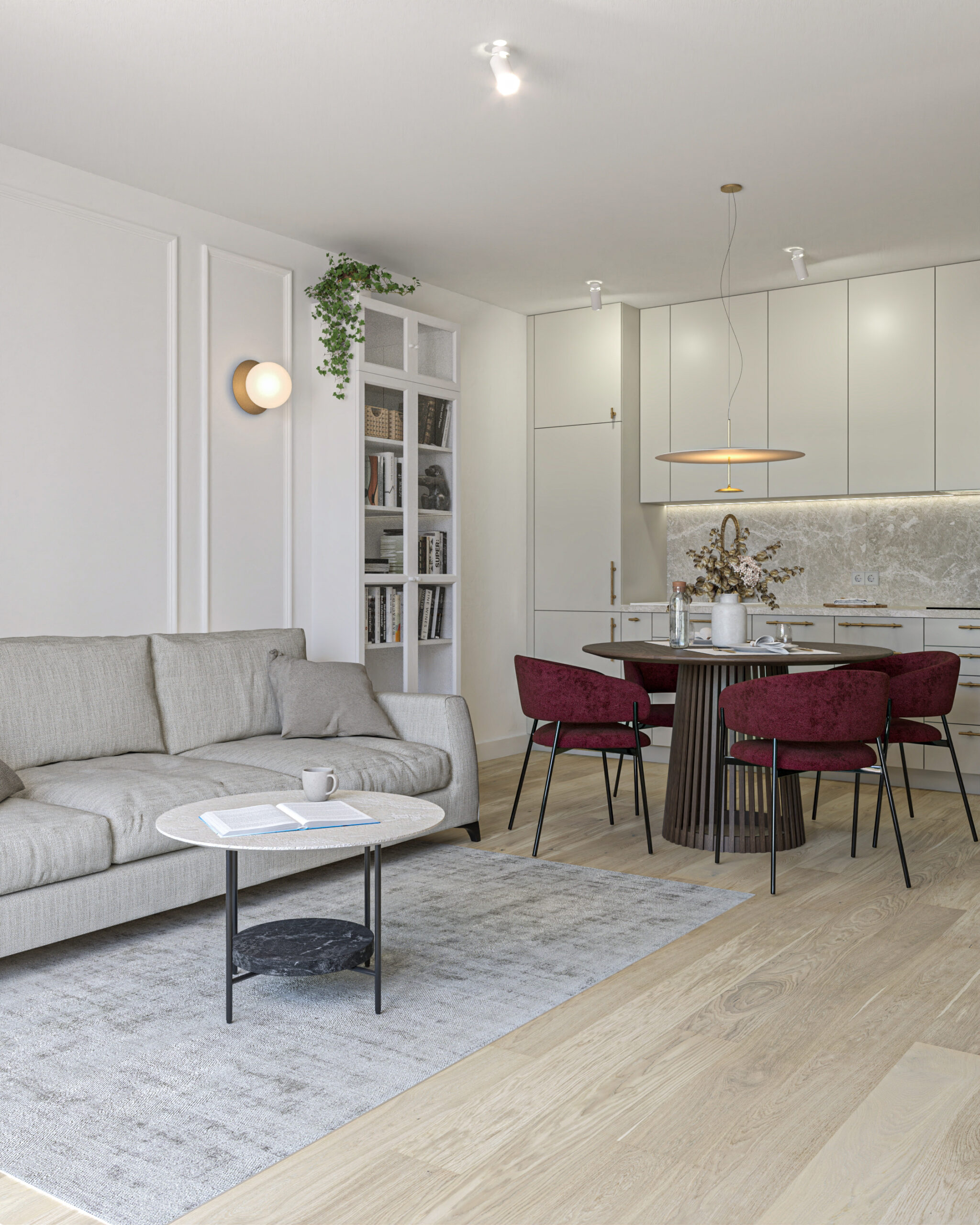 To wnętrze utrzymane jest w stylu modern classic – łączy minimalistyczną formę z subtelnymi, dekoracyjnymi detalami i szlachetnymi materiałami.