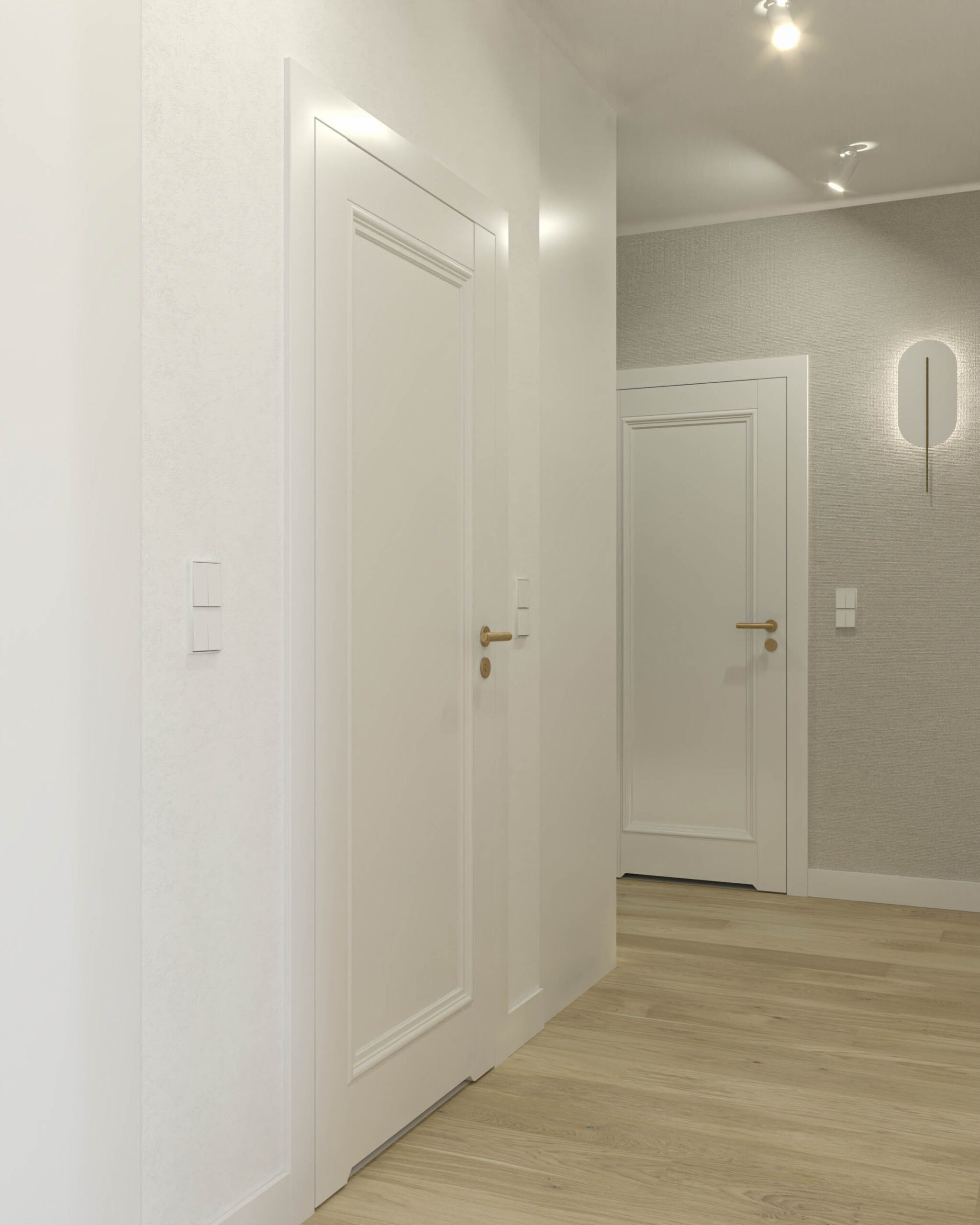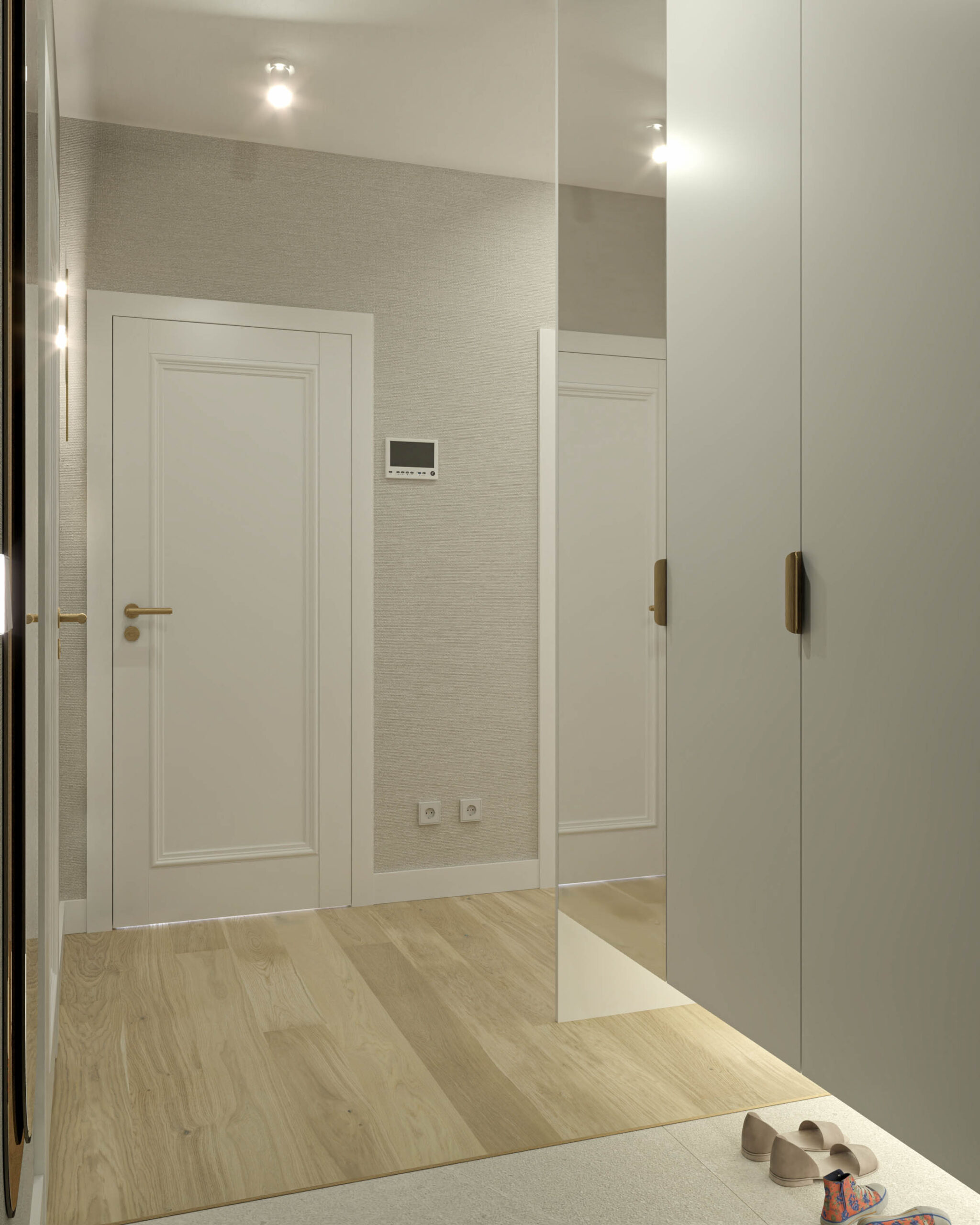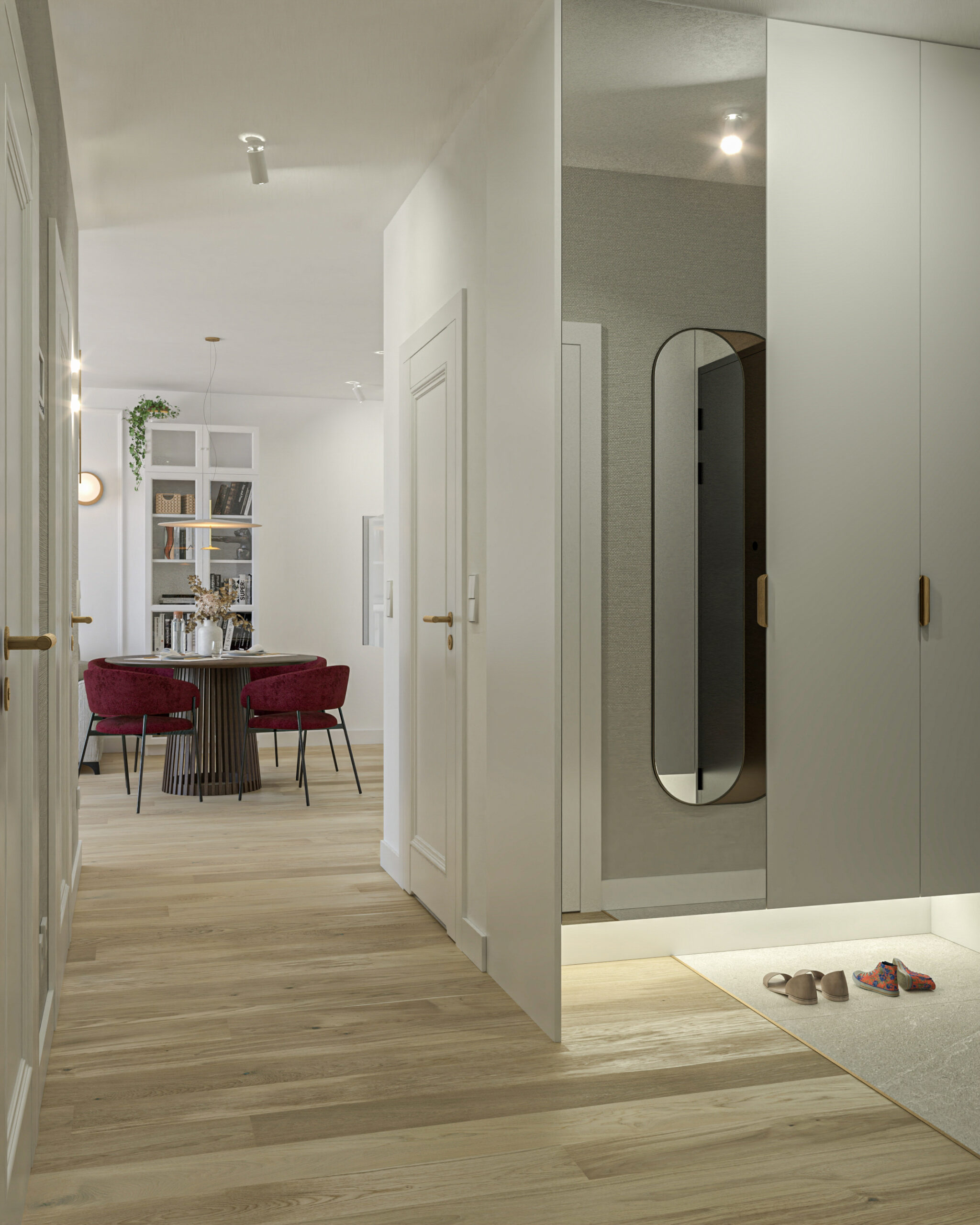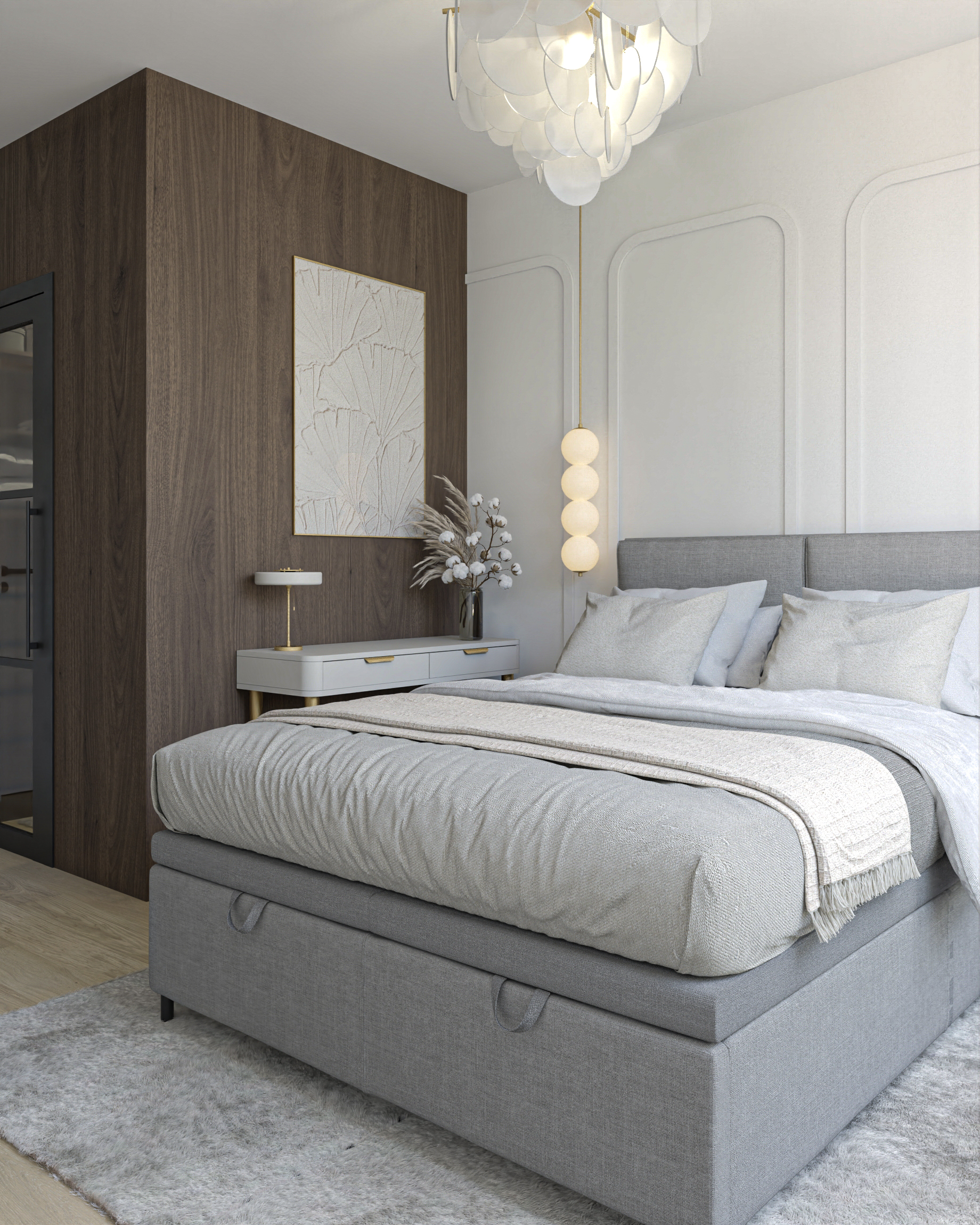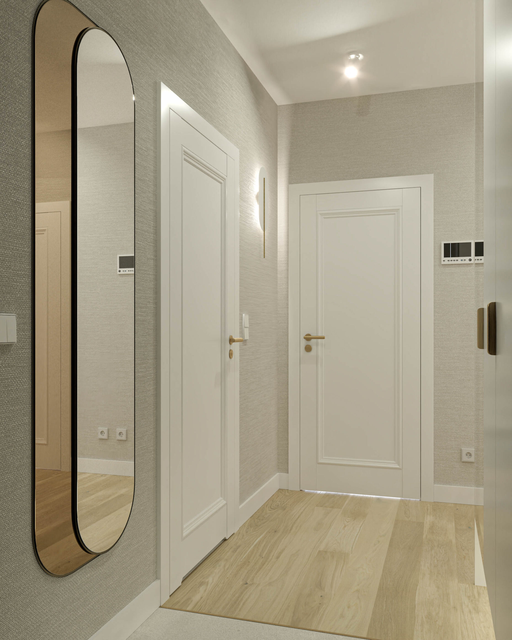 To wnętrze utrzymane jest w stylu modern classic – łączy minimalistyczną formę z subtelnymi, dekoracyjnymi detalami i szlachetnymi materiałami.
