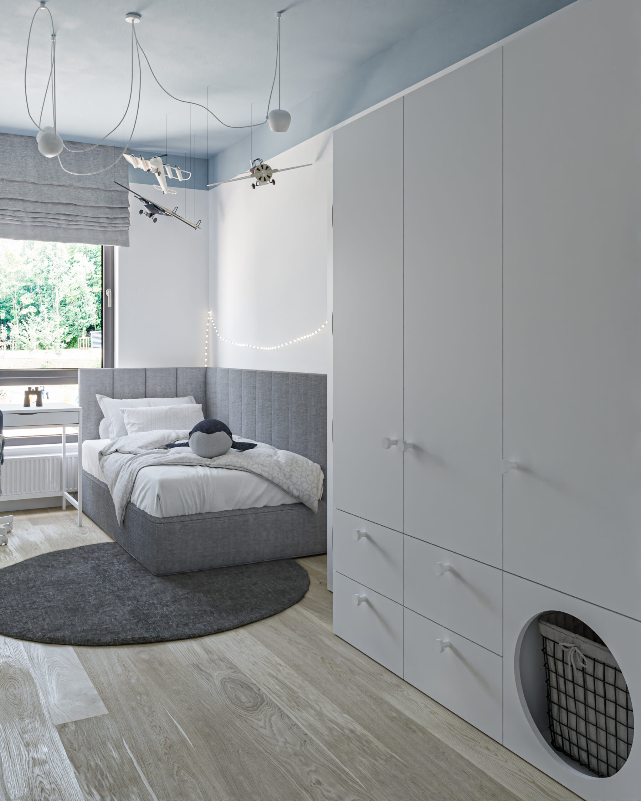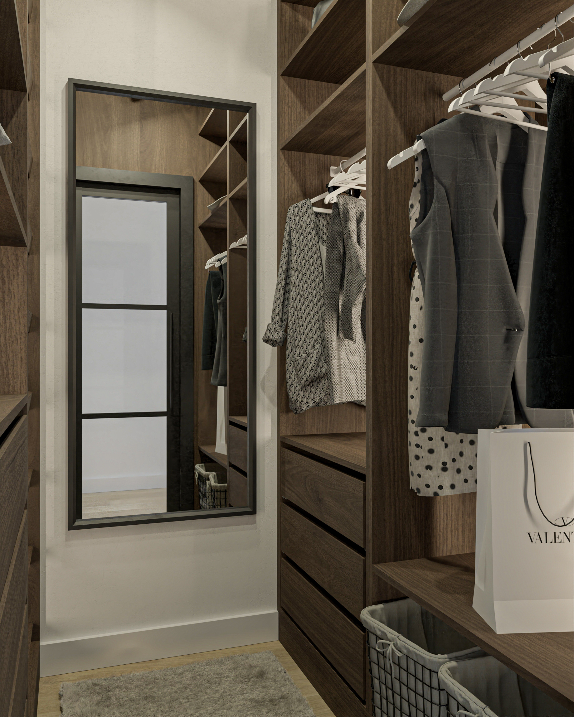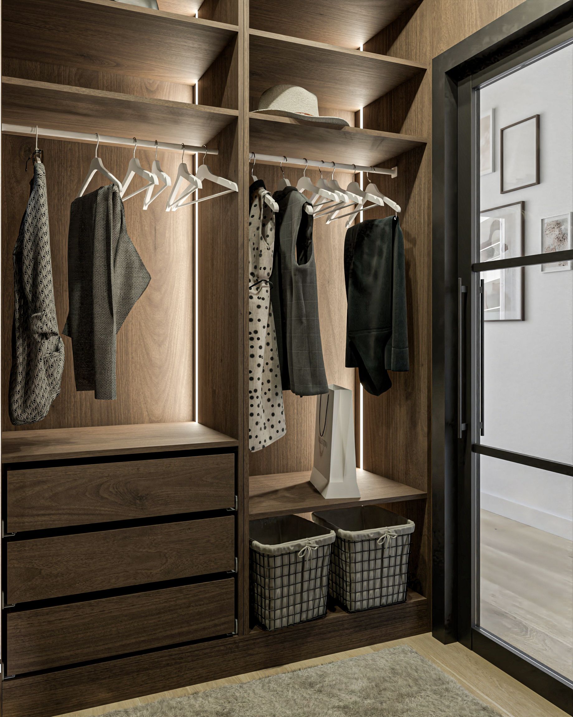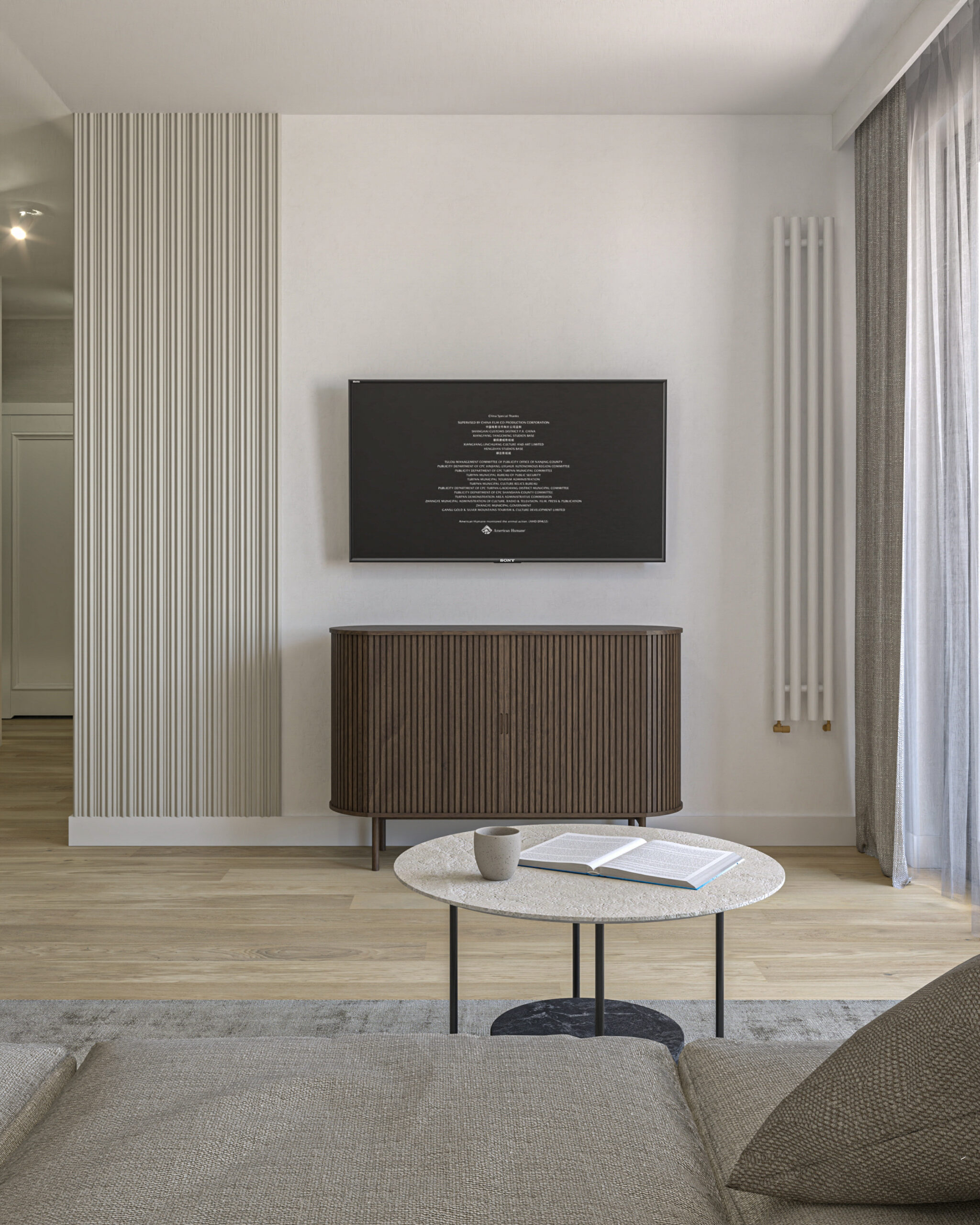 To wnętrze utrzymane jest w stylu modern classic – łączy minimalistyczną formę z subtelnymi, dekoracyjnymi detalami i szlachetnymi materiałami.