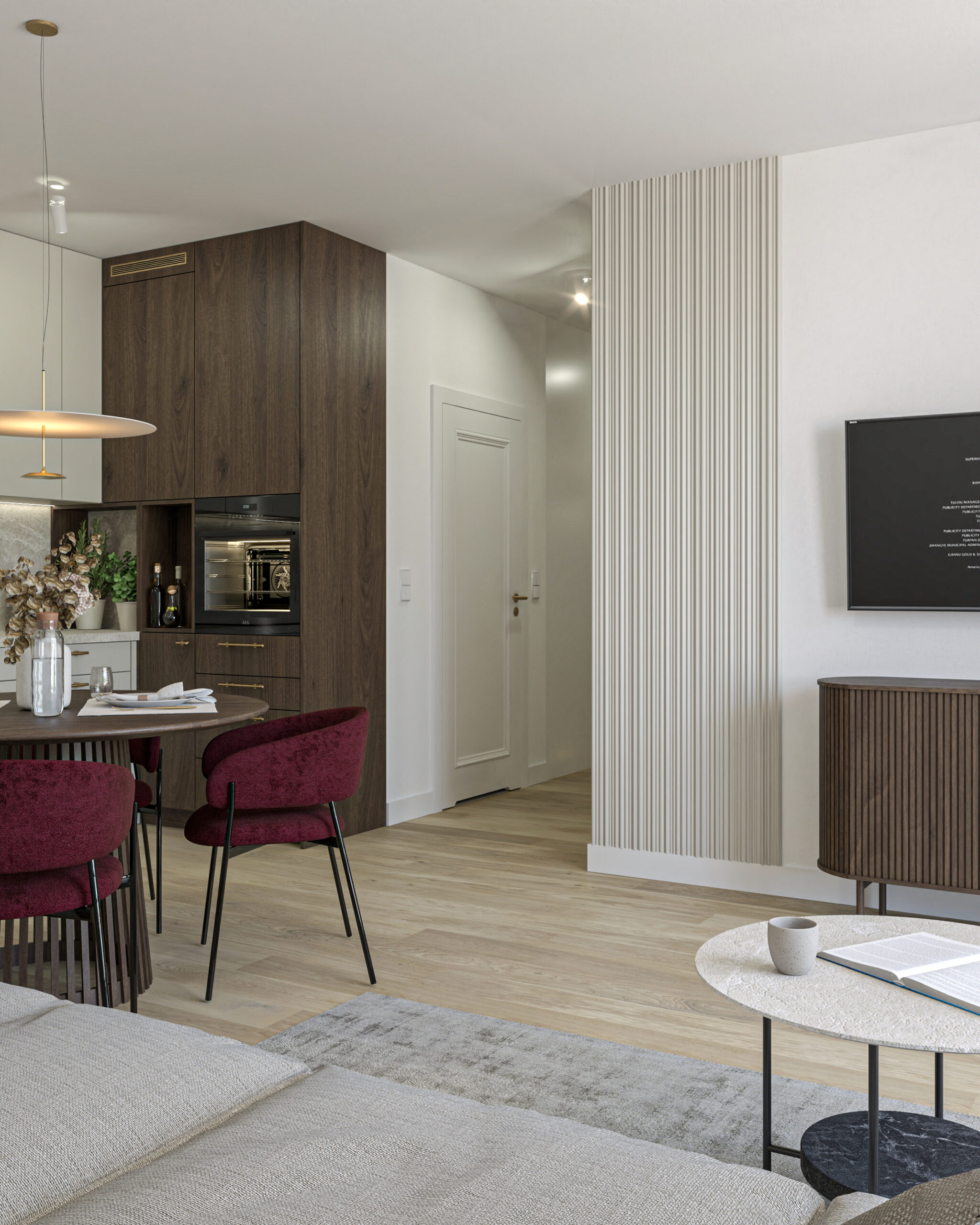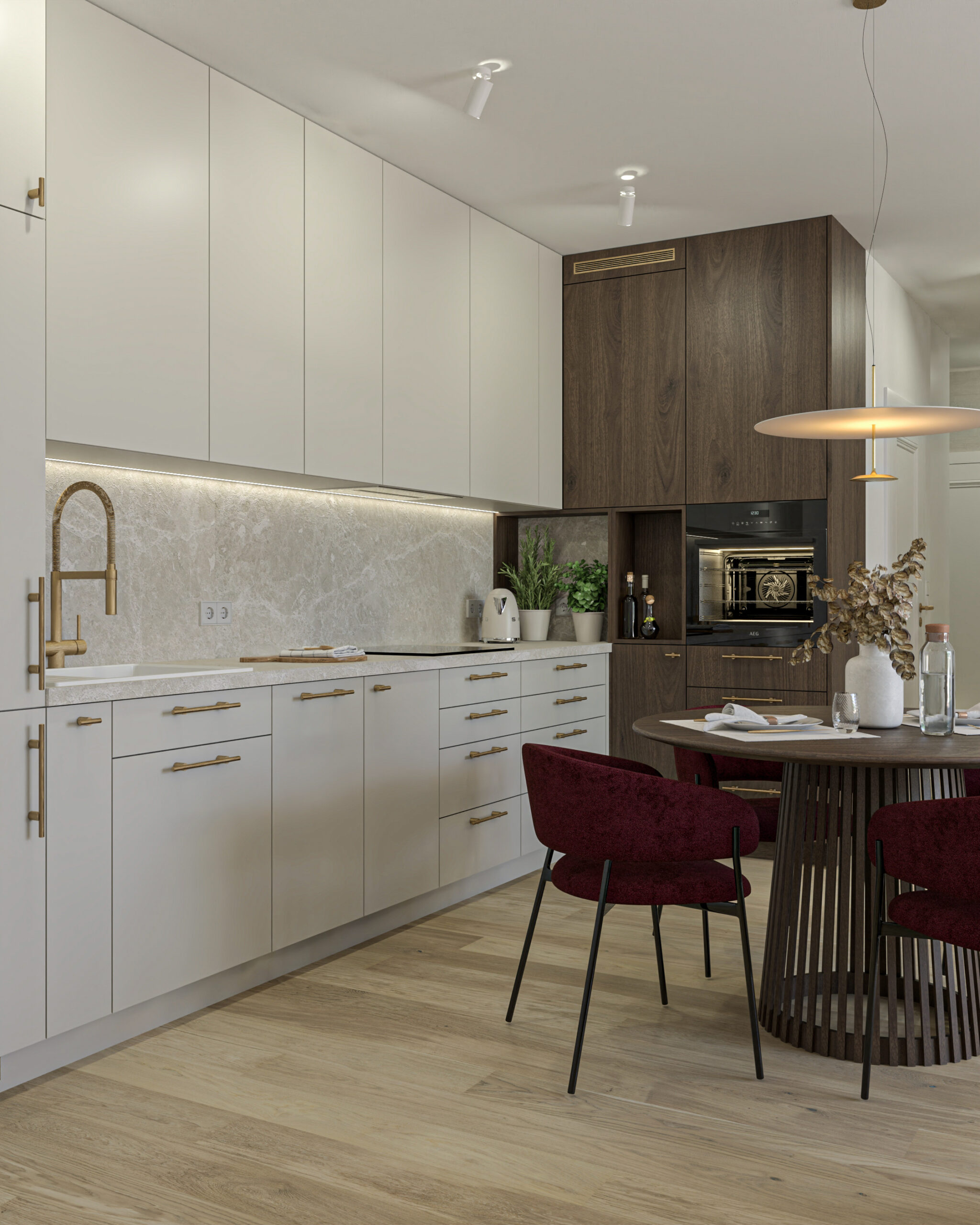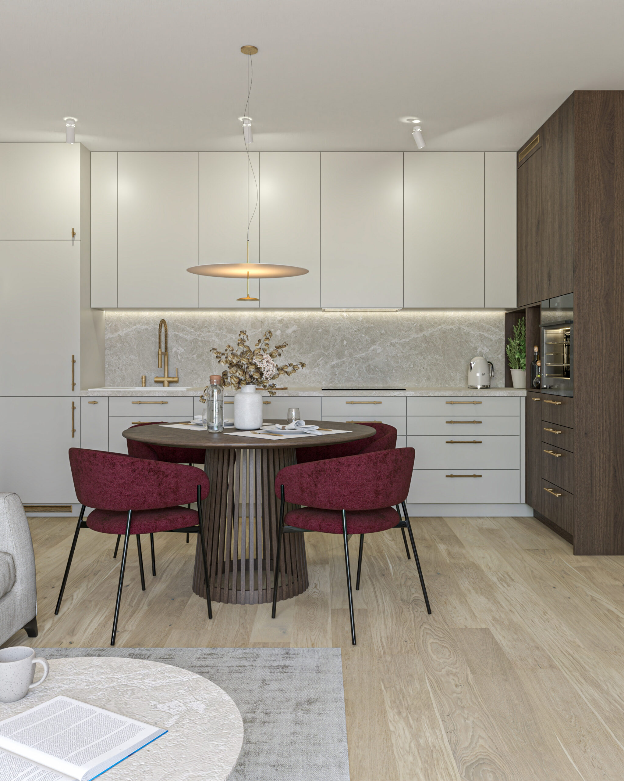 Dominują ciepłe beże, złamana biel i odcienie taupe, przełamane głębokim, burgundowym akcentem krzeseł w jadalni. Ten kolor stanowi wyrazisty, elegancki kontrapunkt dla spokojnej, naturalnej bazy i buduje charakter całego projektu.