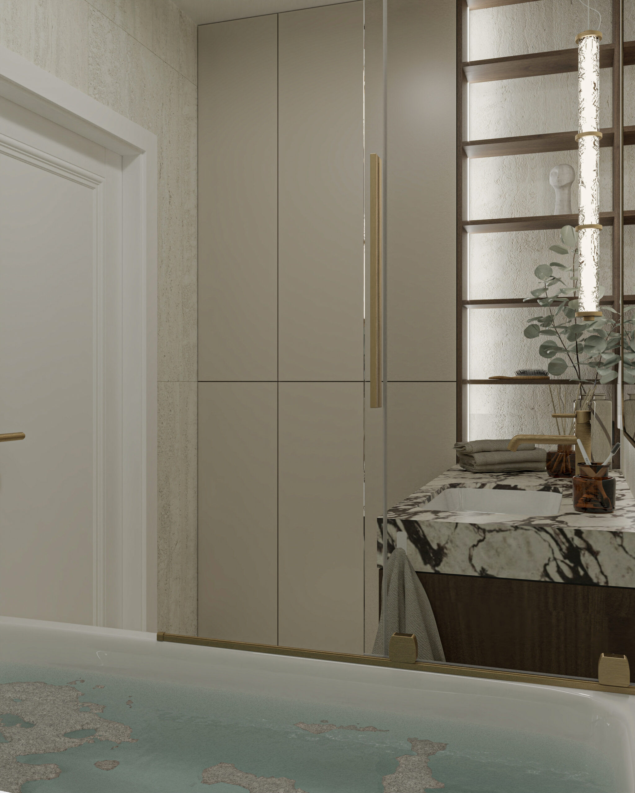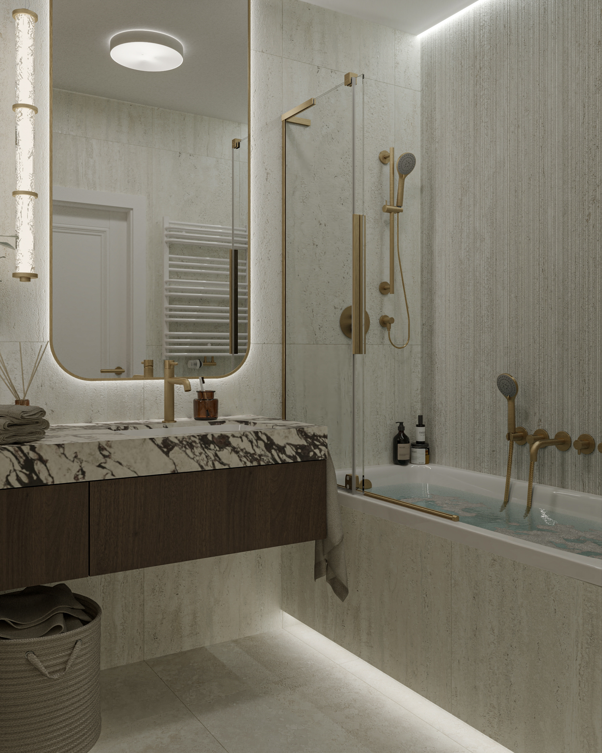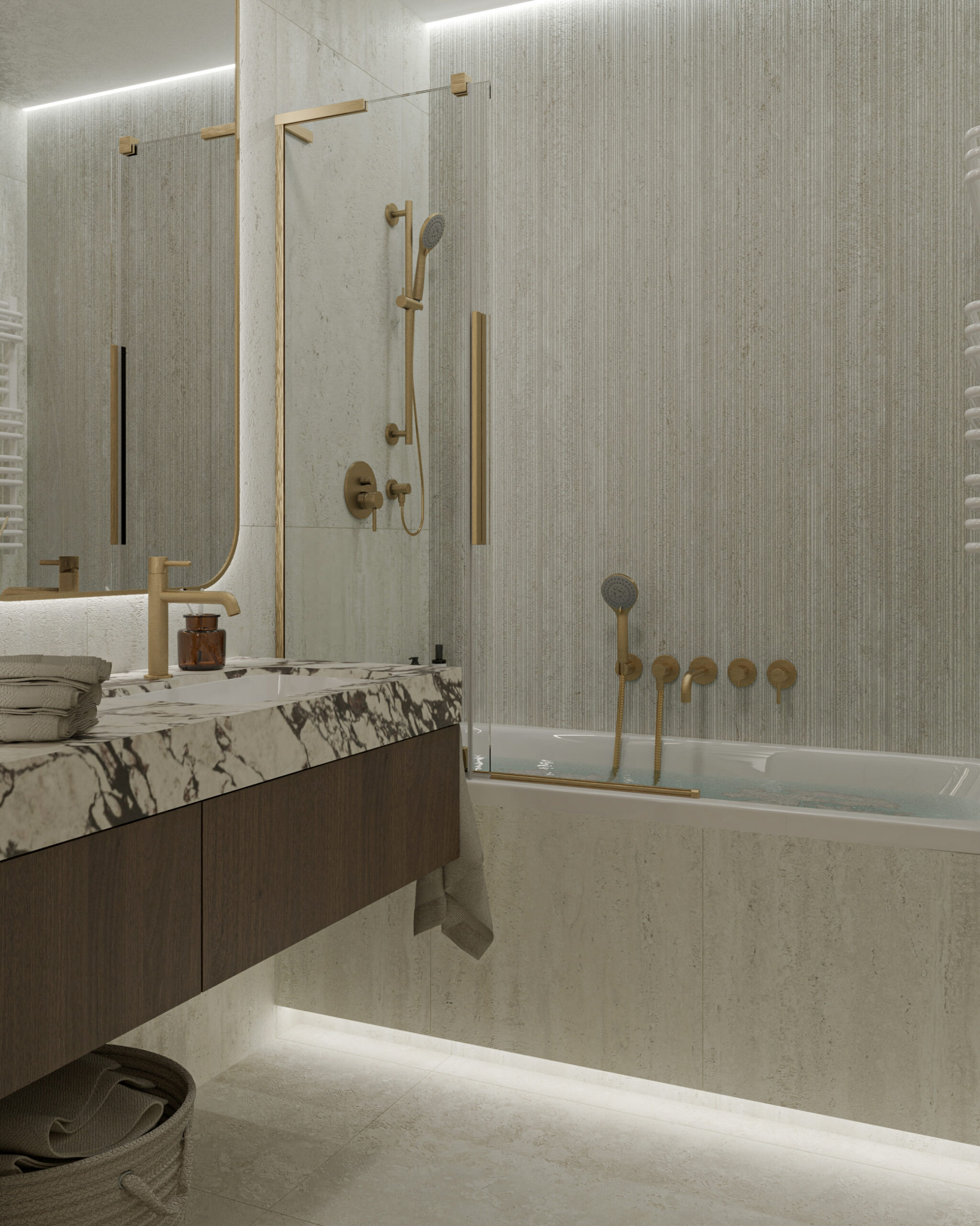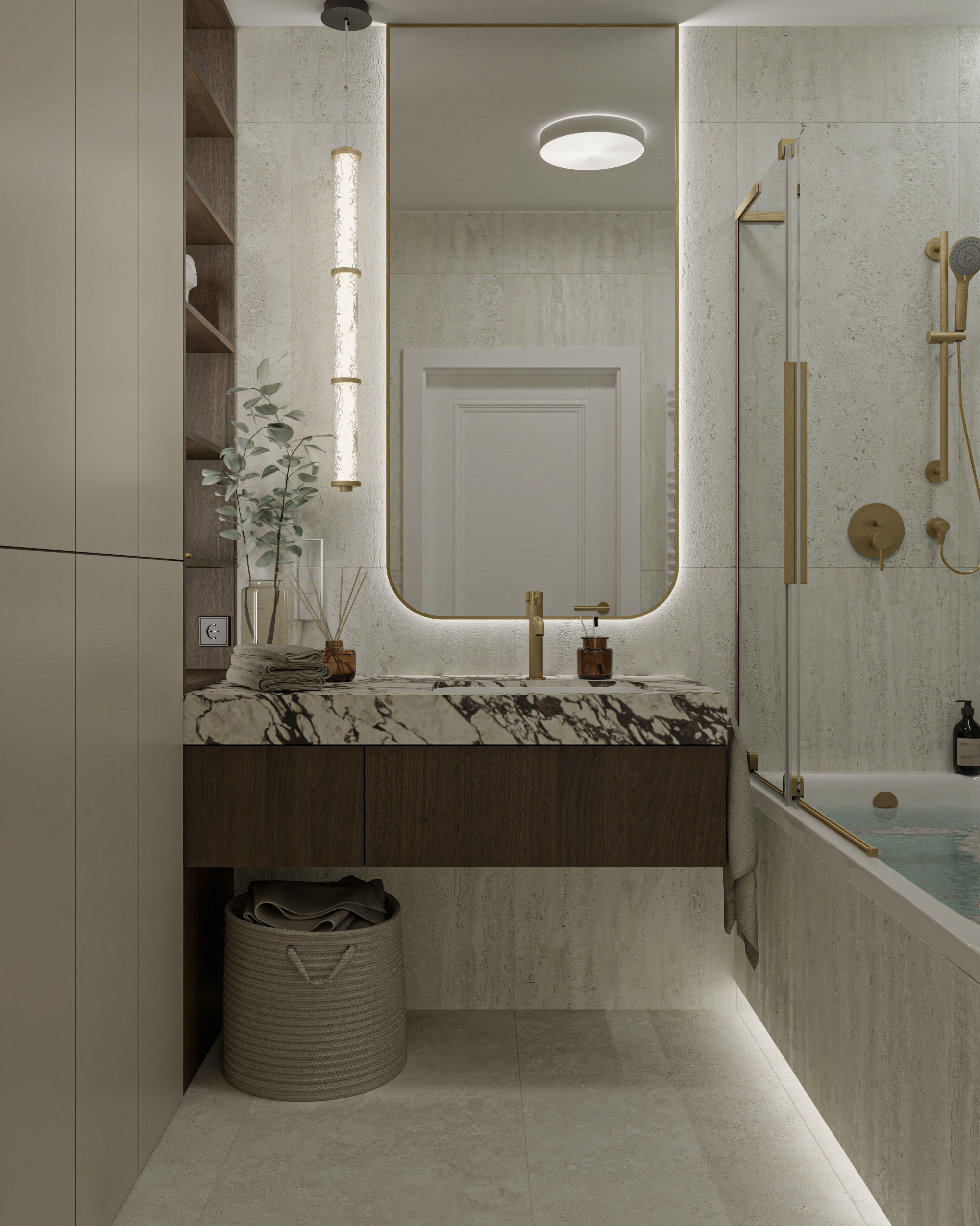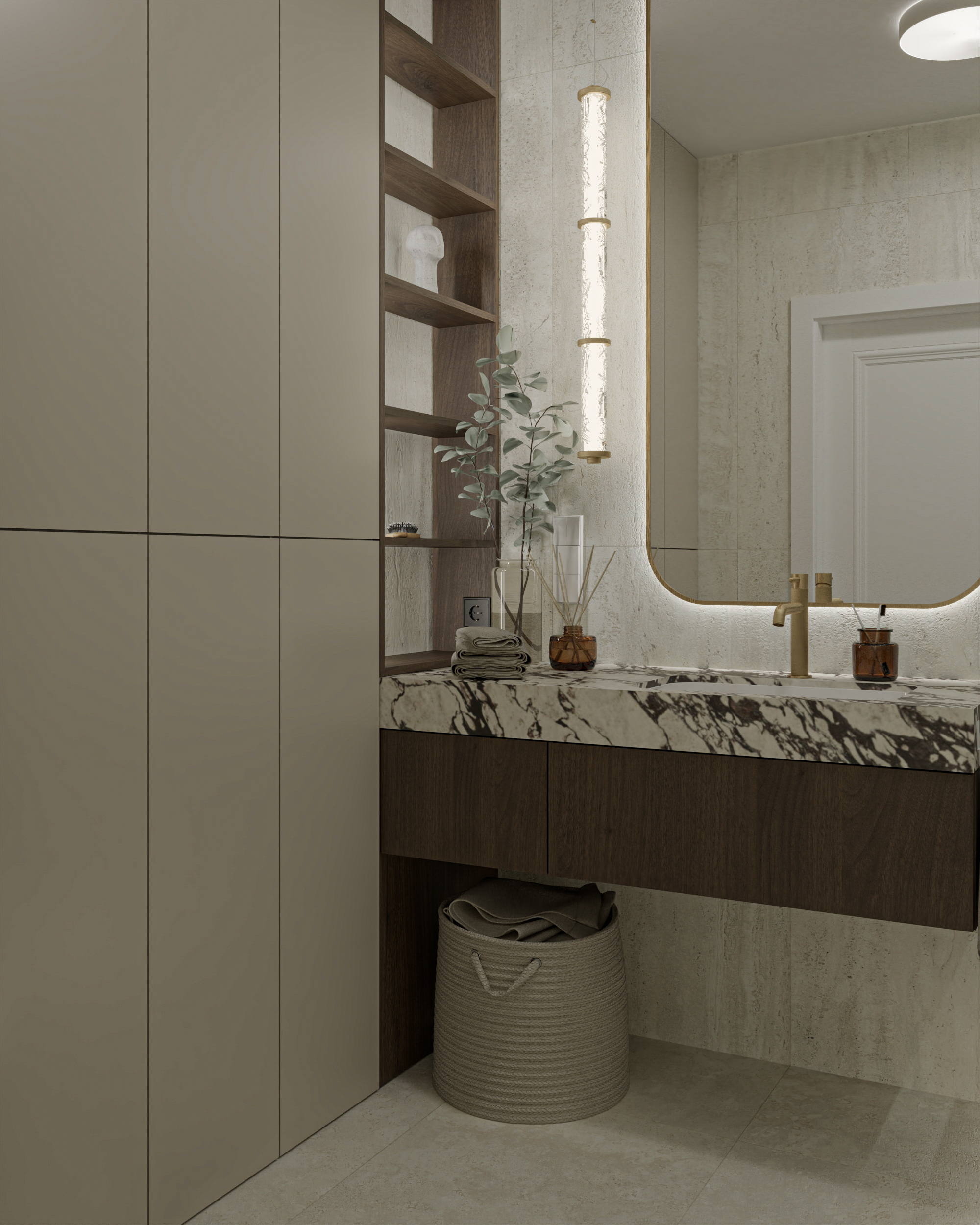 Bazę stanowią naturalne materiały w połączeniu z ciemniejszą orzechową płytą meblową, która nadaje kontrast. W łazience pojawia się element dekoracyjny w postaci blatu o wyrazistym rysunku, zestawiony z beżową okładziną ścienną idealnie naśladującą trawertyn. Całość uzupełniają złote, szczotkowane detale – baterie, uchwyty i oprawy oświetleniowe – które nadają wnętrzu subtelnej szlachetności.