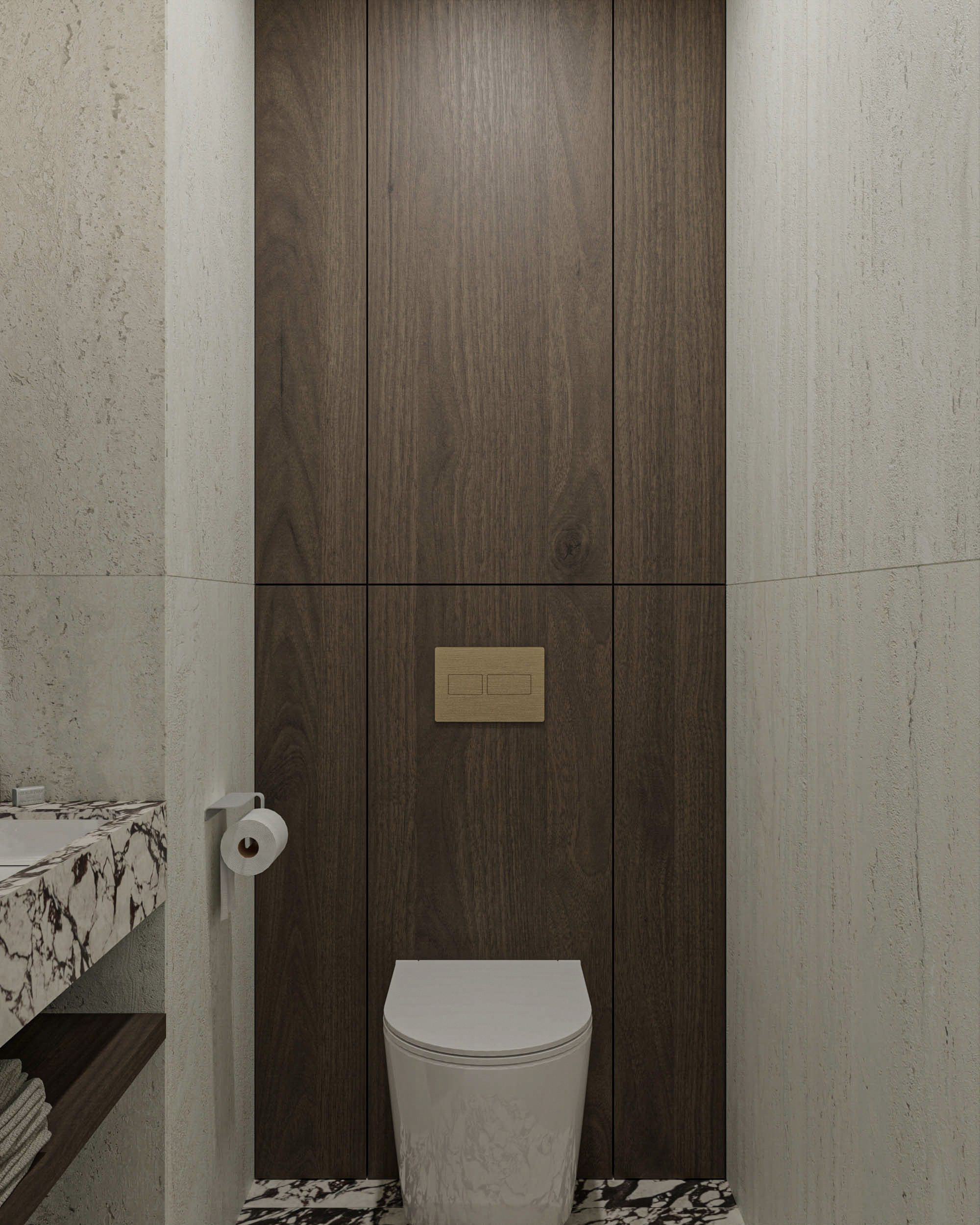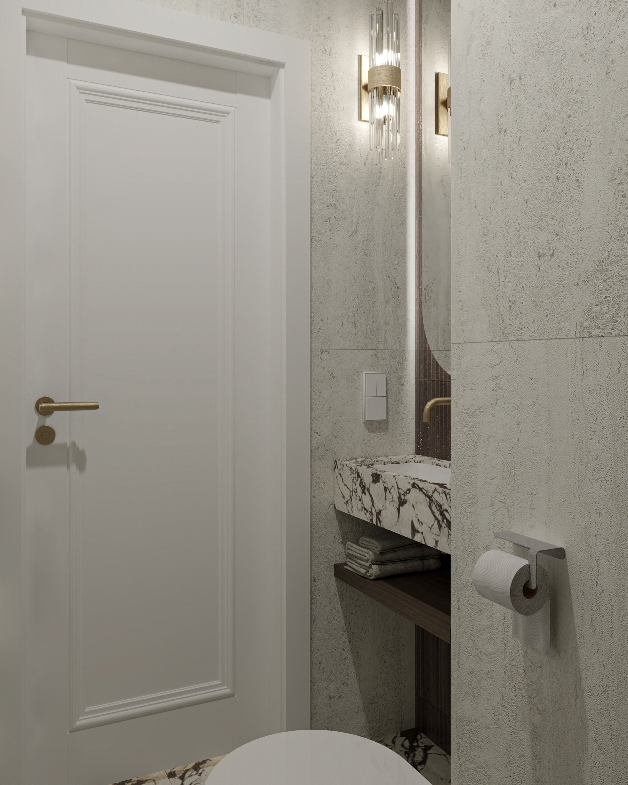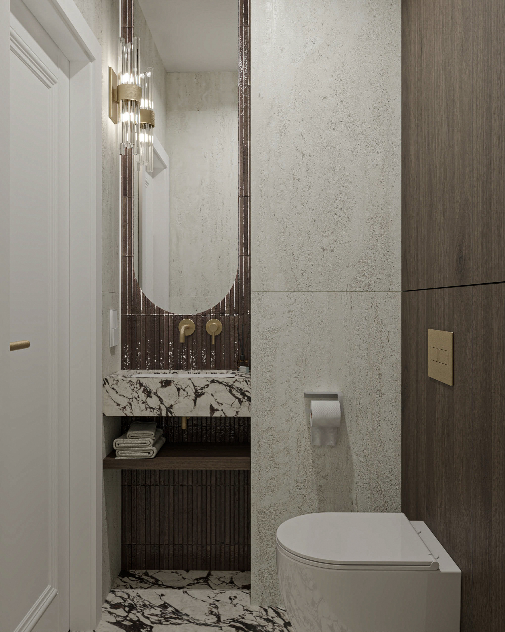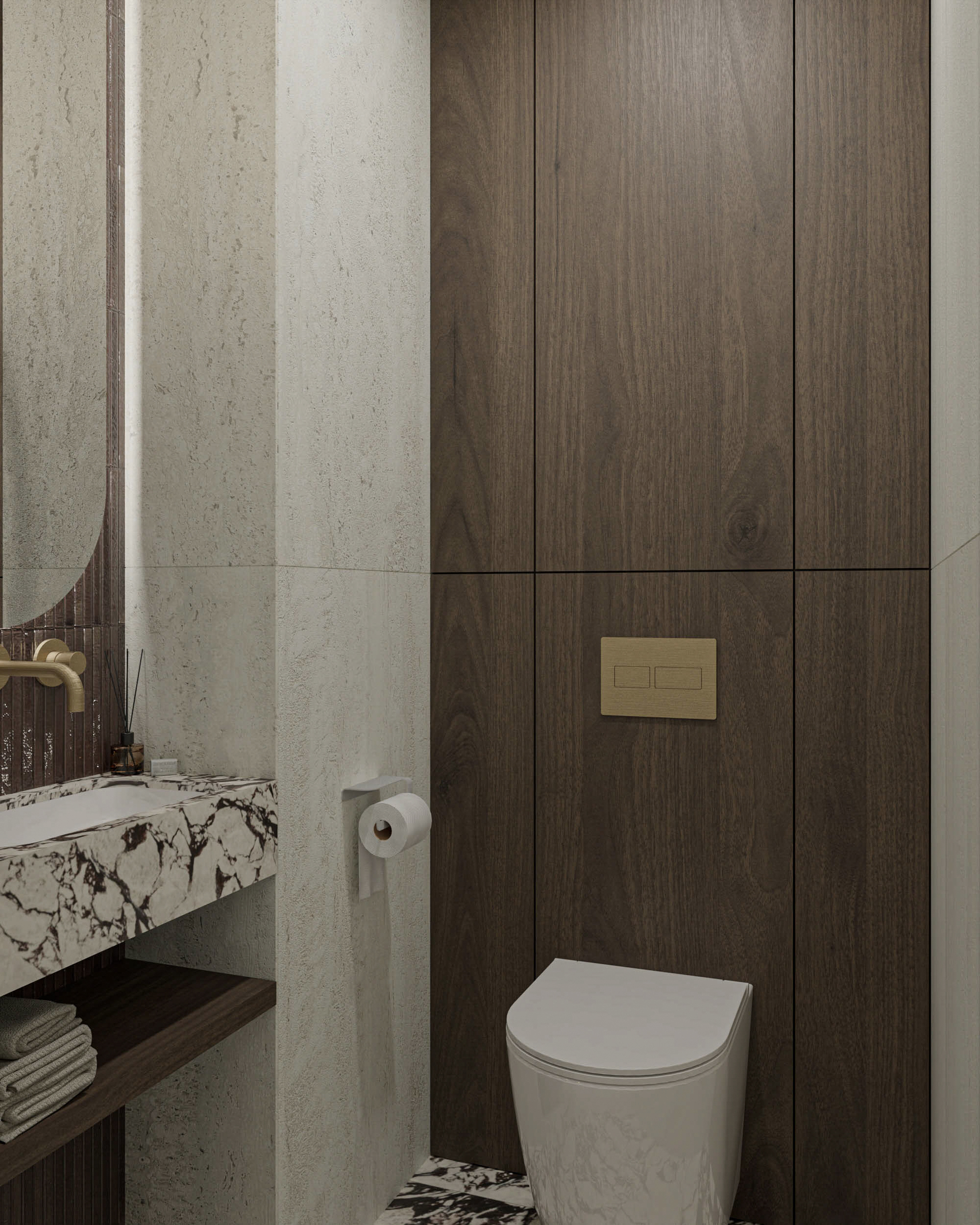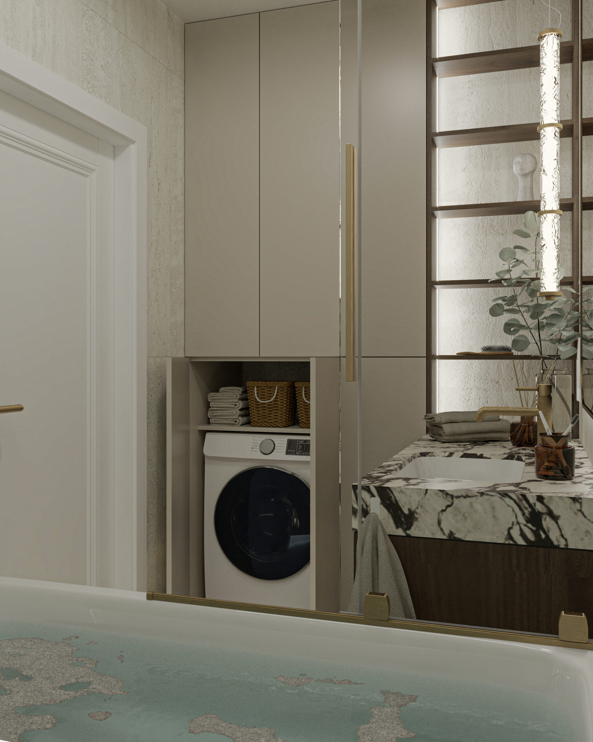 Bazę stanowią naturalne materiały w połączeniu z ciemniejszą orzechową płytą meblową, która nadaje kontrast. W łazience pojawia się element dekoracyjny w postaci blatu o wyrazistym rysunku, zestawiony z beżową okładziną ścienną idealnie naśladującą trawertyn. Całość uzupełniają złote, szczotkowane detale – baterie, uchwyty i oprawy oświetleniowe – które nadają wnętrzu subtelnej szlachetności.
